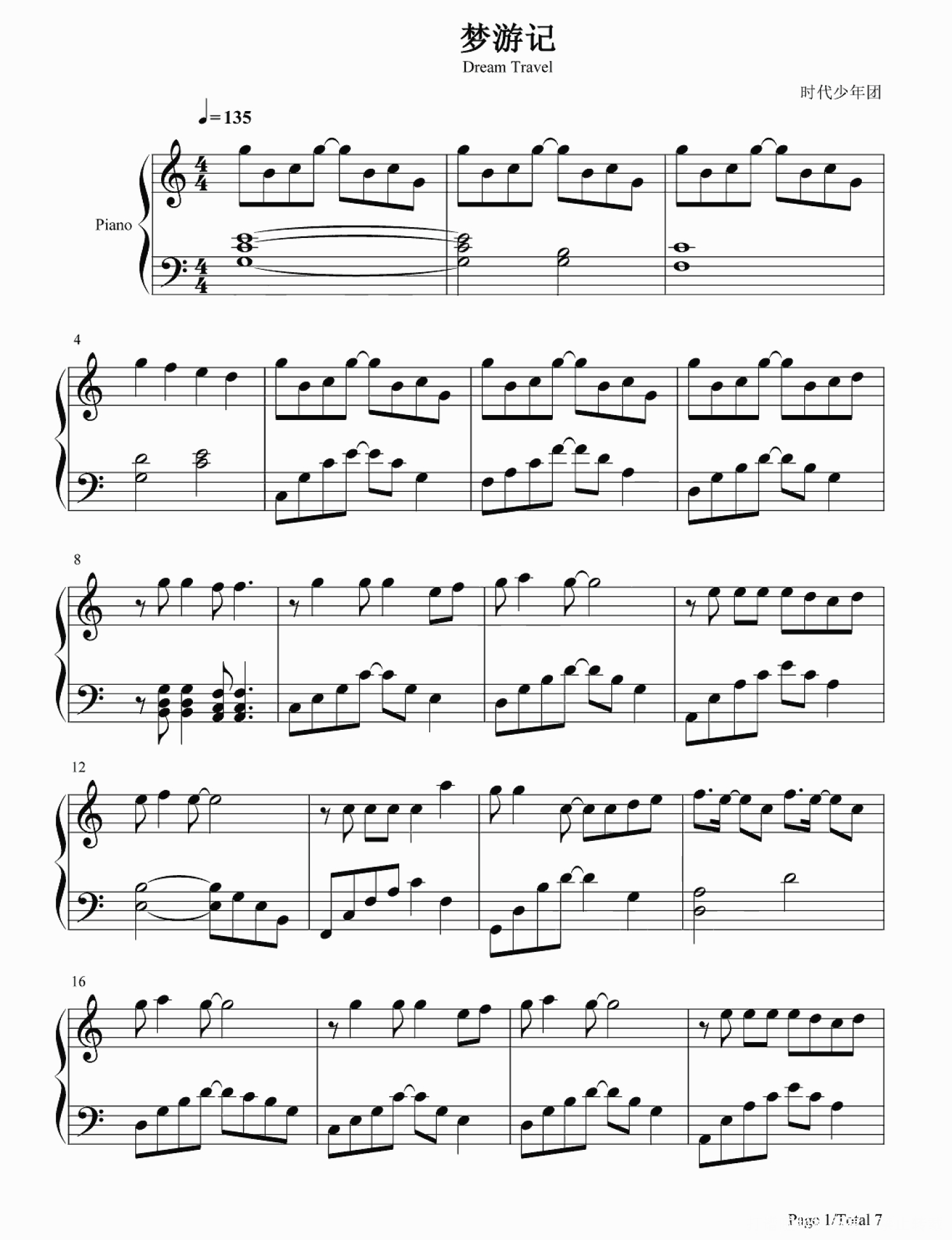 曲谱介绍: 该曲谱是高清版《梦游记》钢琴谱,由谱友精心编配制谱并分享。这是时代少年团发行一首歌曲,是时代少年团团综《少年梦游记》的主题曲。他们用单纯的声音提醒你,快来吧,如果还有未曾实现的平凡愿望和英雄梦想,那来一次梦游也无妨。 时代少年团(Teens in Times、TNT)是由时代峰峻推出的中国内地男子演唱组合,由马嘉祺、丁程鑫、宋亚轩、刘耀文、张真源、严浩翔、贺峻霖七人组成。