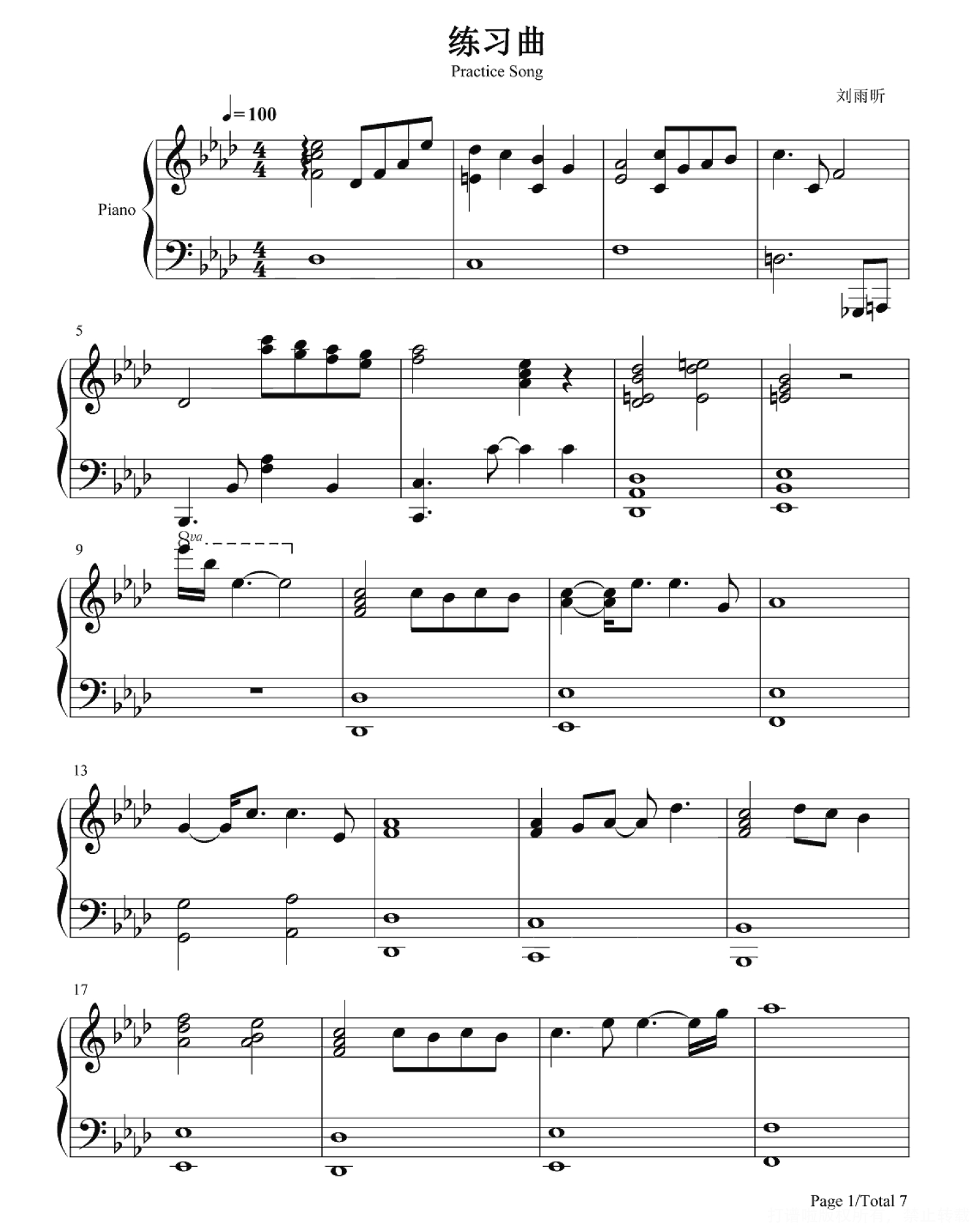曲谱介绍: 刘雨昕《练习曲》钢琴谱,由谱友精心编配制谱,完整版共7张PNG格式图片五线谱。歌曲由八三夭阿璞(李贤璞)和刘雨昕共同作词,李贤璞作曲,罗龙杰RevoJay编曲并制作。打谱啦还为大家提供了刘雨昕更多热门歌曲的高清曲谱,欢迎查询。 《练习曲》也是刘雨昕送给自己成长之路的。我们都是追梦路上长途跋涉的旅人,将沿途的景色写成诗篇,把行囊里珍藏的记忆串成音符,跨过山海,穿过森林,迎来花信。仍踏实,仍刻苦,仍有爱,初心不忘。