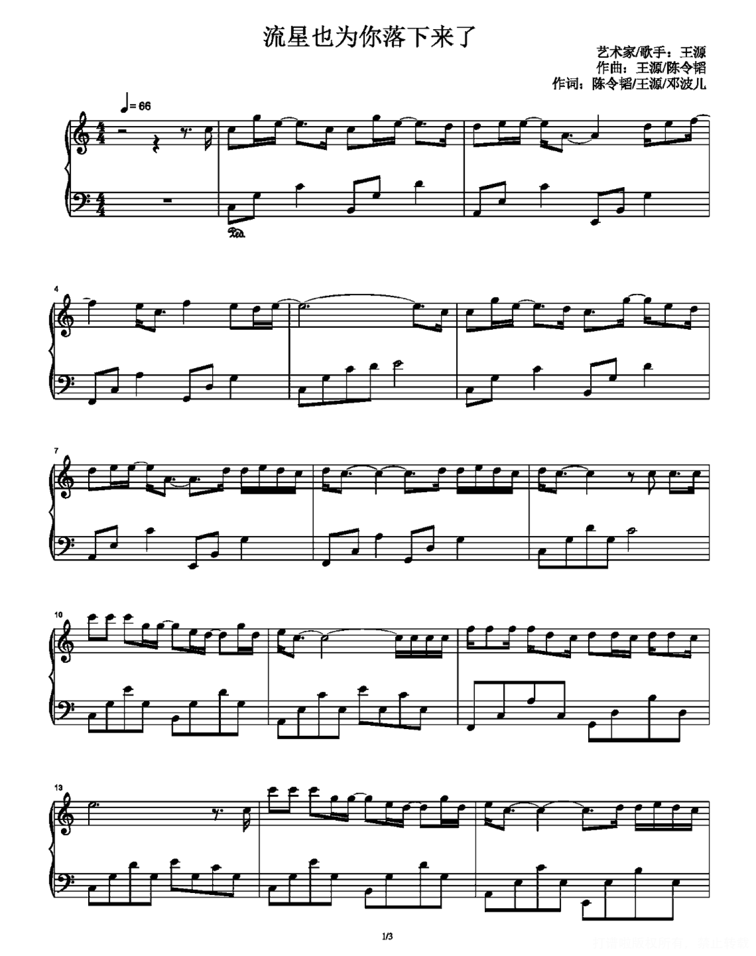 曲谱介绍: 该版本的《流星也为你落下来了》钢琴谱是高清完整版五线谱,共3张PNG格式图片谱。歌曲是由王源、陈令韬作曲,陈令韬、王源、邓波儿作词,王源演唱。打谱啦还提供了王源更多热门歌曲的吉他谱、简谱等曲谱,欢迎查询。