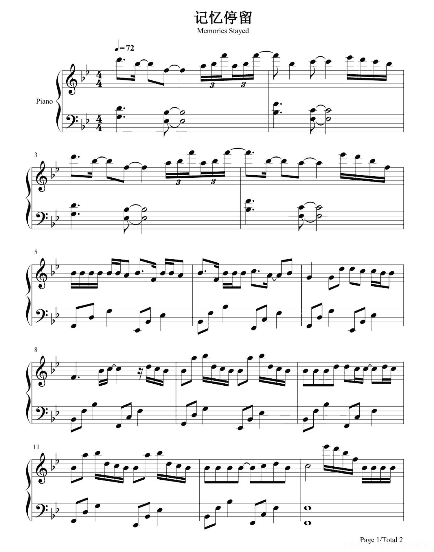 记忆停留钢琴谱 - 蓝心羽