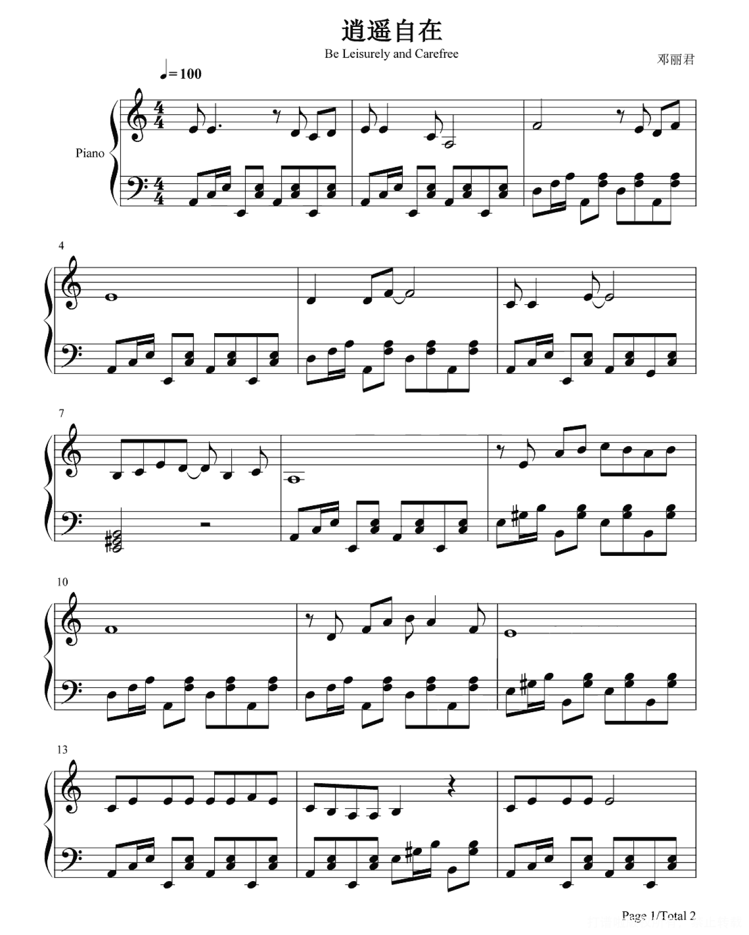 逍遥自在钢琴谱 - 邓丽君