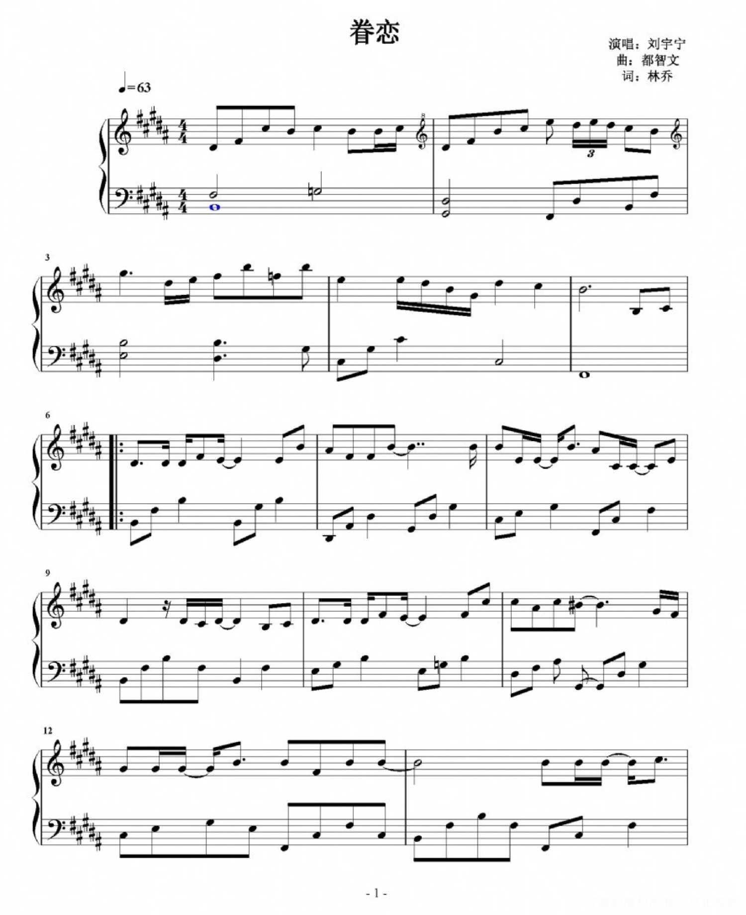 眷恋钢琴谱 - 刘宇宁