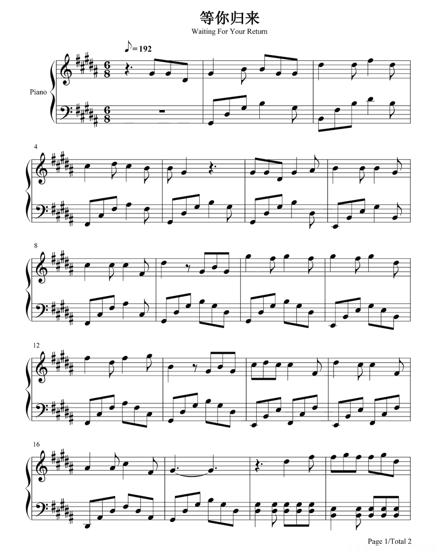 等你归来钢琴谱 - 程响