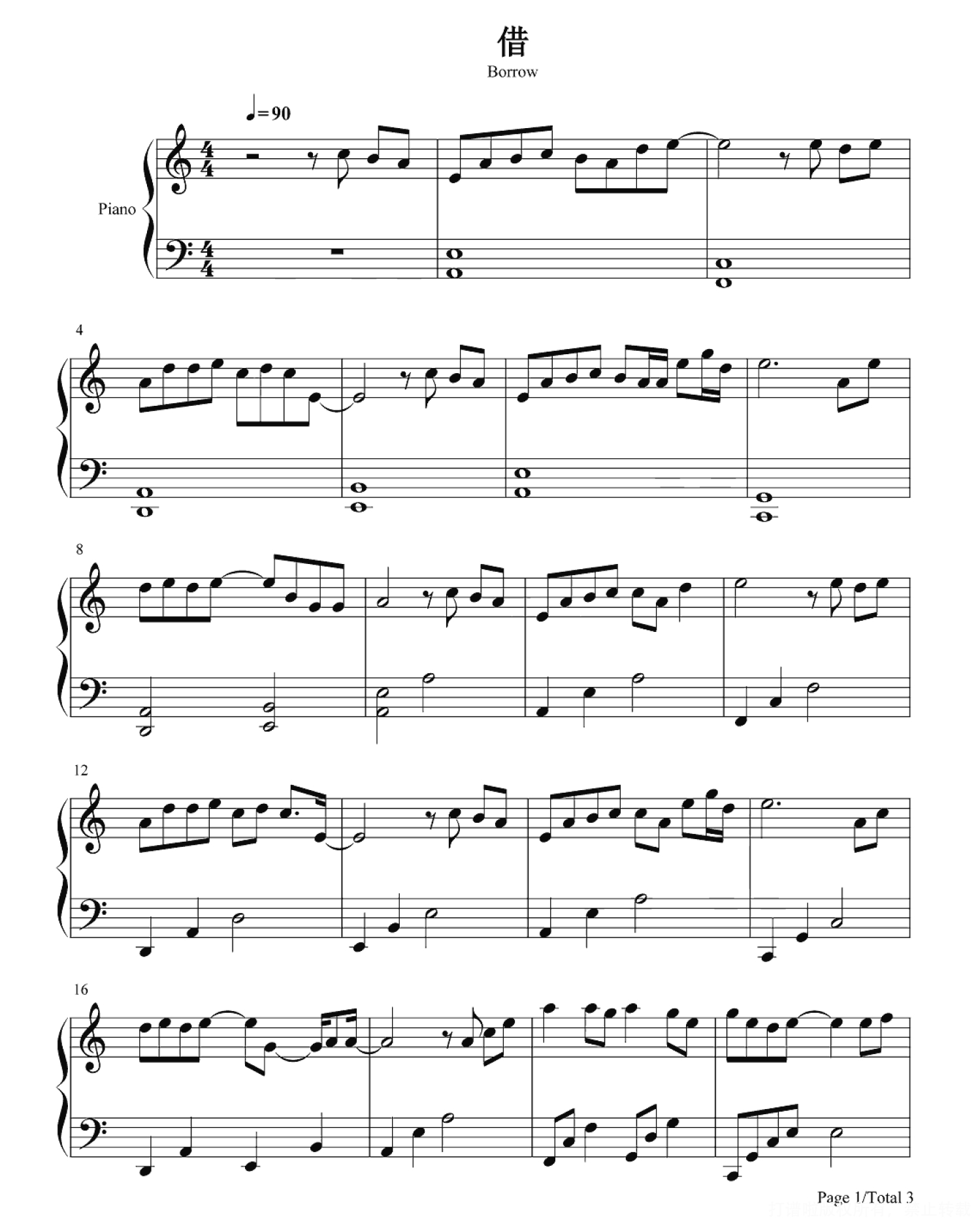 曲谱介绍: 毛不易《借》钢琴谱,由谱友精心编配制谱,完整版共3张PNG格式图片五线谱。除了《借》高清版钢琴谱,打谱啦还收录了毛不易更多热门歌曲不同类型或格式的曲谱,欢迎您浏览及分享。 凭借这首原创歌曲《借》毛不易再次让所有人为之惊艳。一向对毛不易要求苛刻的华晨宇也不禁对毛不易表示盛赞。