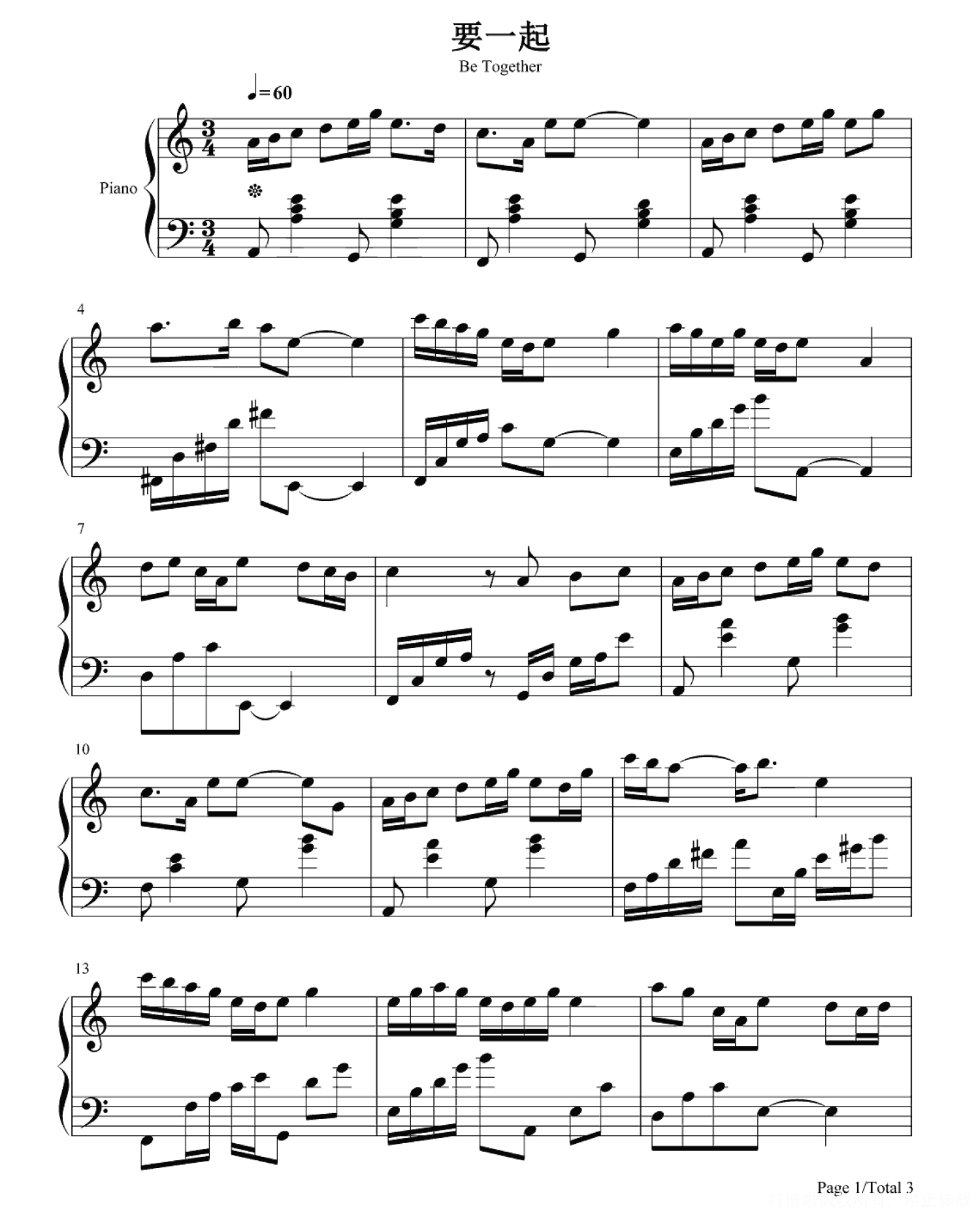 曲谱介绍: 周深《要一起》钢琴谱,由谱友精心编配制谱,完整版共3张PNG格式图片五线谱。歌曲作为电视剧《锦心似玉》主题曲。打谱啦还收录了周深更多热门歌曲不同类型或格式的曲谱,欢迎您浏览及分享。 周深灵动细腻的声线,时而轻快婉转,时而缠绵缱绻。他以独特的唱功和细腻的情感张力,一字一句将感情全数倾泻,诠释出侯爷和十一娘细水流长的爱情故事。