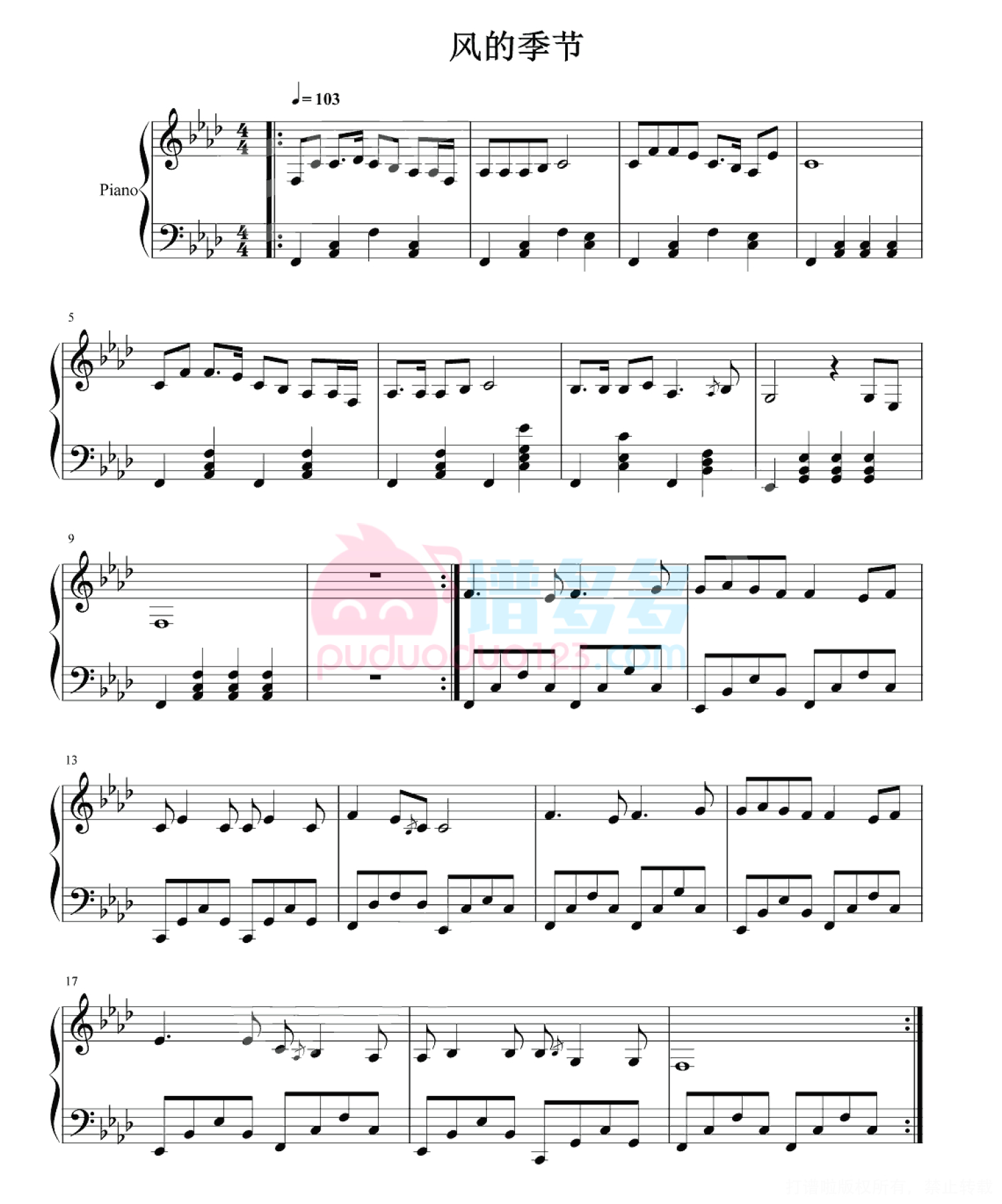 曲谱介绍: 抖音热歌张云雷演唱《风的季节》钢琴谱,由谱友精心编配制谱,完整版共1张PNG格式图片五线谱。除了《风的季节》高清版钢琴谱,打谱啦还为大家提供了张云雷更多热门歌曲的简谱、吉他谱等高清曲谱,欢迎查询。