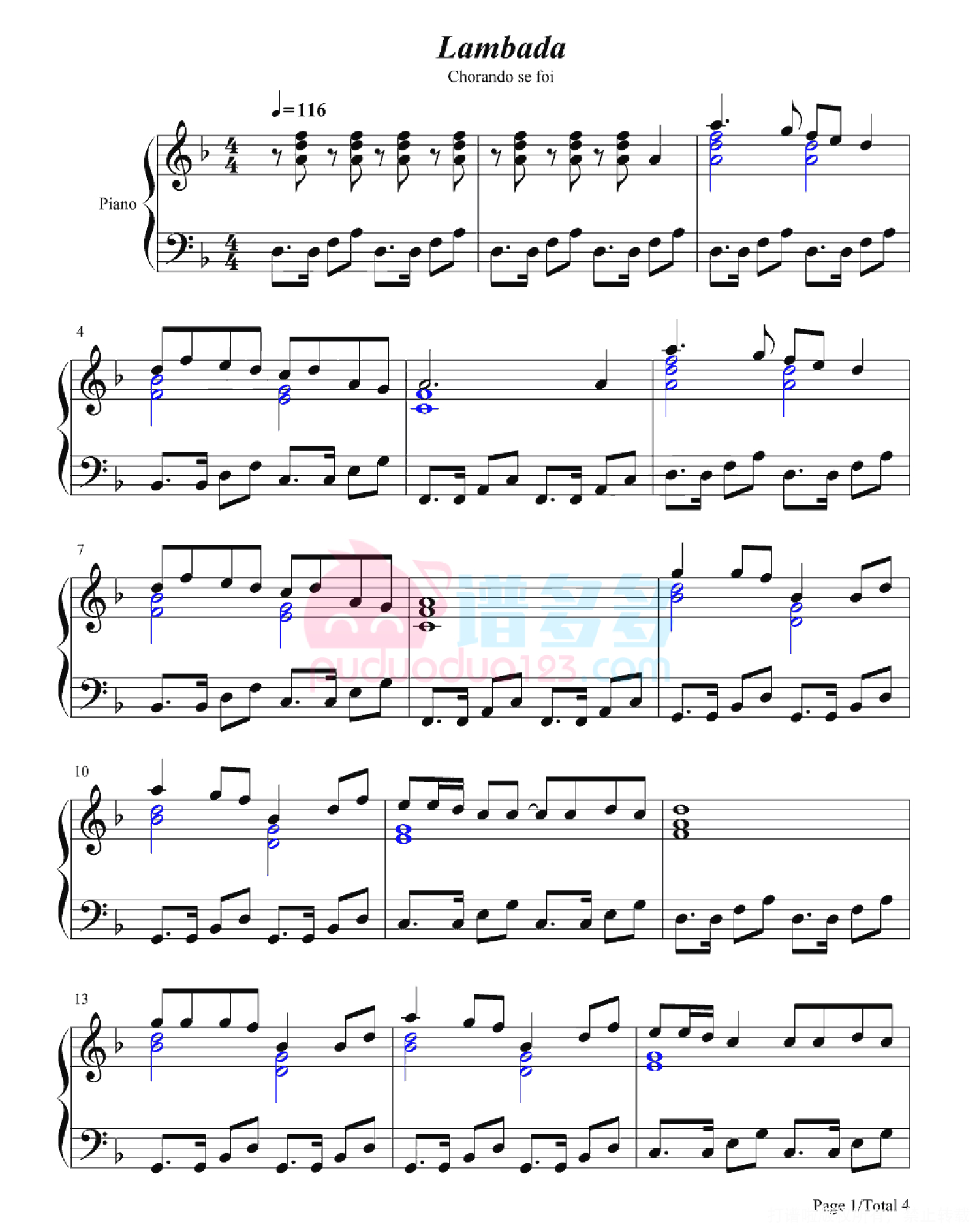 曲谱介绍: 流行音乐组合Kaoma《Lambada》钢琴谱,由谱友精心编配制谱,完整版共4张PNG格式图片五线谱。除了《Lambada》高清版钢琴谱,打谱啦还收录了Kaoma更多热门歌曲不同类型或格式的曲谱,欢迎您浏览及分享。