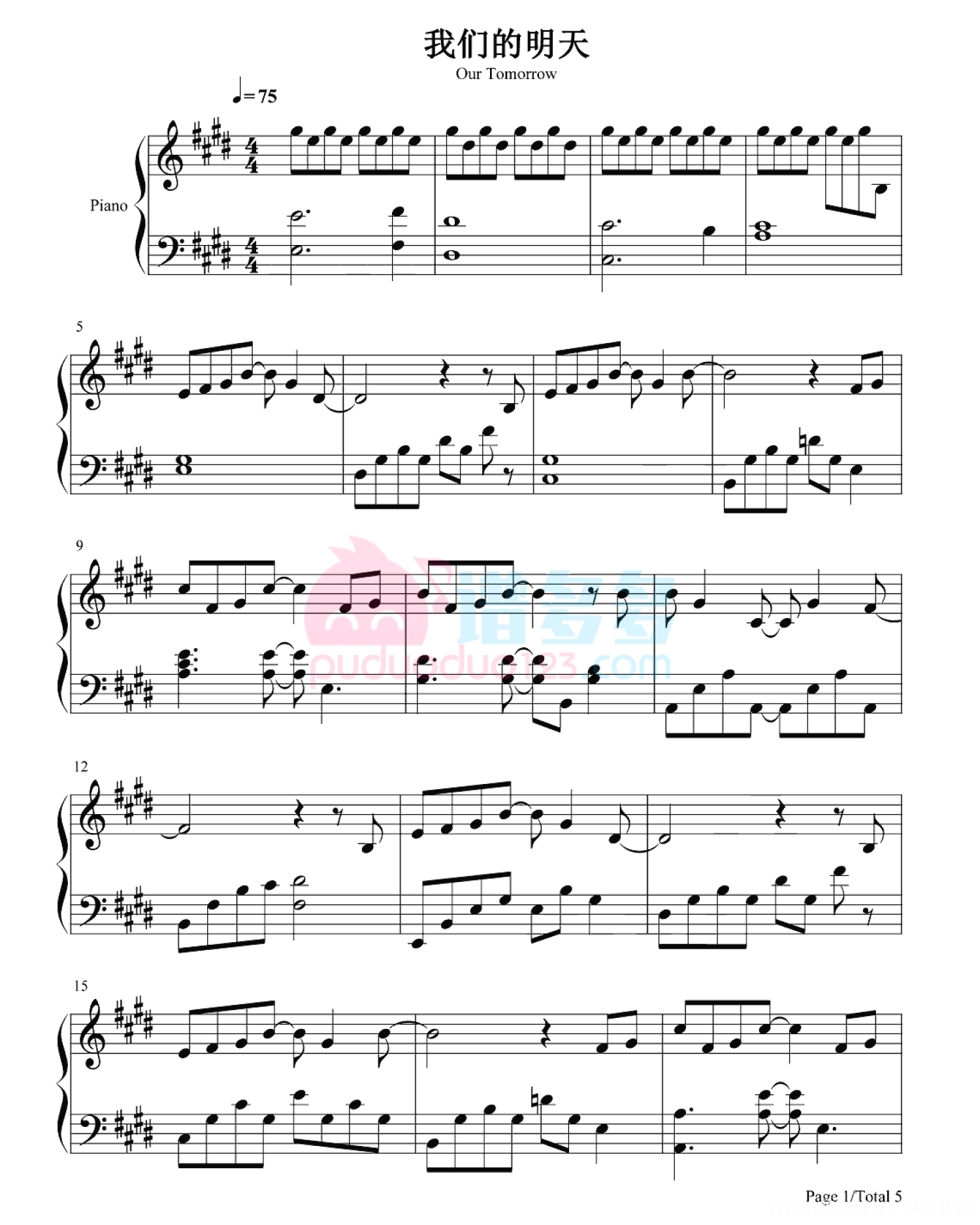 曲谱介绍: 打谱啦为您提供《我们的明天》的高清版钢琴谱,由谱友精心编配制谱并分享,共5张PNG格式图片五线谱。《我们的明天》是电影《重返20岁》的主题曲,由鹿晗演唱。打谱啦还收录了《我们的明天》其它类型或格式的曲谱,欢迎您浏览及分享。鹿晗,用自身干净、真诚的嗓音,诠释着属于鹿晗的音乐。这一次他用自己的真心,用心中最真实的语言,告诉所有人他值得等待,告诉所有人他会变得更好。