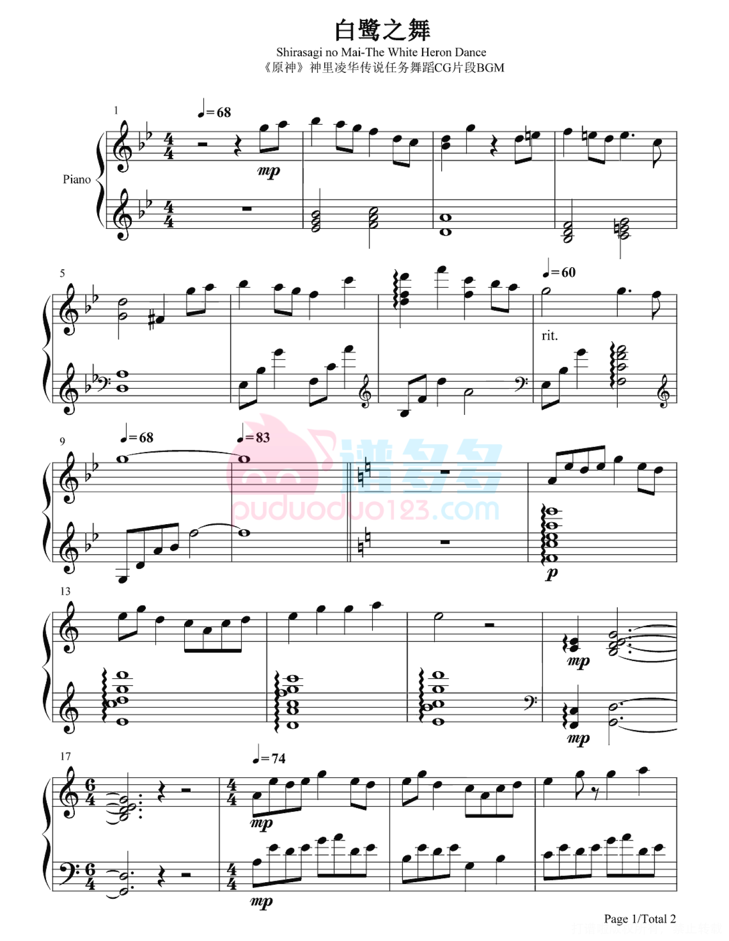 曲谱介绍: 该曲谱是高清版《白鹭之舞》钢琴谱,由谱友精心编配制谱并分享。完整版《白鹭之舞》钢琴谱,共2张PNG格式图片五线谱。另外打谱啦还提供了《白鹭之舞》其它格式或类型的谱子,欢迎您收藏和分享。 白鹭之舞是《原神》神里凌华传说任务舞蹈CG片段BGM。白鹭素有优雅从容的特点,好似披着白纱的斯文少女。正如神里绫华展现出来的一般,优雅大方。