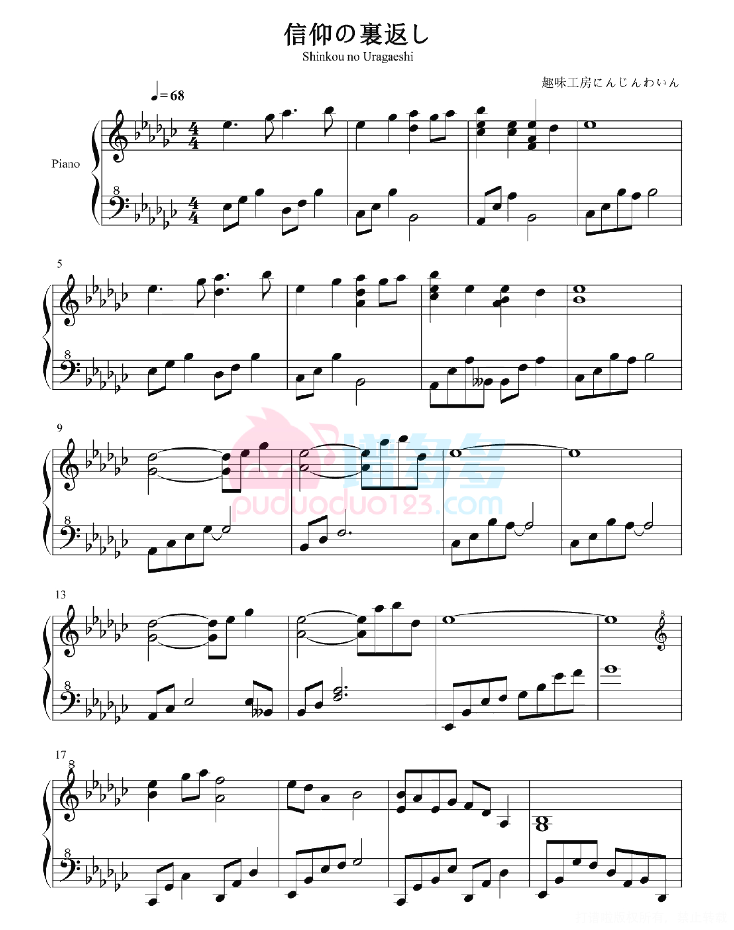 曲谱介绍: 该曲谱是高清版《信仰の裏返し》钢琴谱,由谱友精心编配制谱并分享。《信仰の裏返し》来自同人社团趣味工房にんじんわいん的一首东方二创曲,原曲为《明日ハレの日、ケの昨日》, 曲子本身是一首清新宁静的钢琴曲,相当空灵。不论是否信仰神明,神明都毫无差别的爱着世间万物。曲子营造出了宁静安详的气氛,让听者感到安心的感觉,借音乐触碰到内心最柔软的部分。