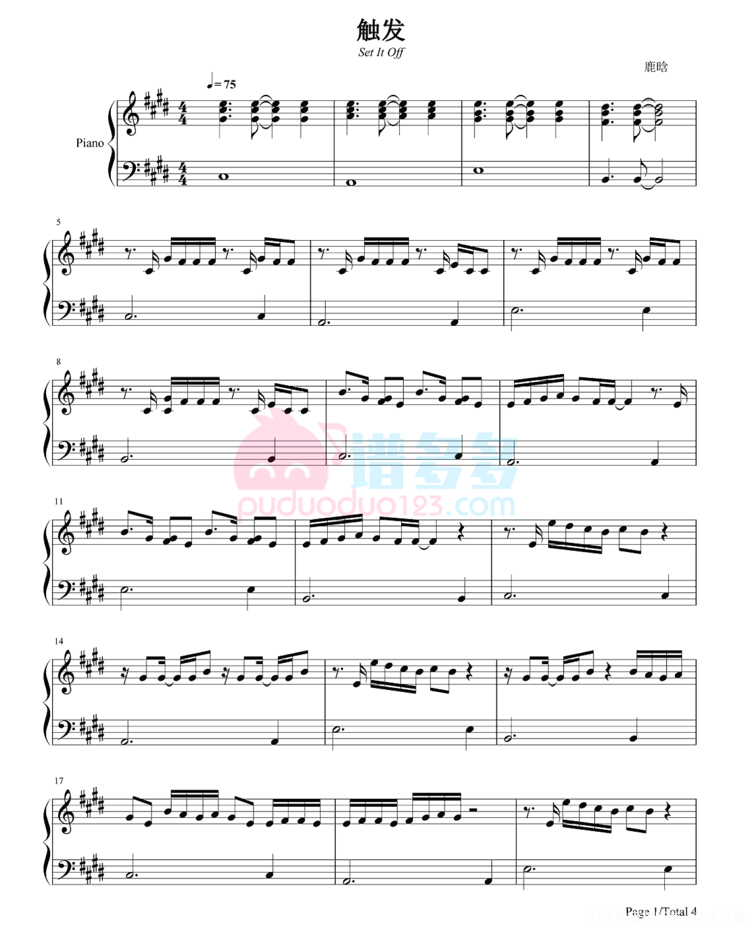 曲谱介绍: 鹿晗《触发》钢琴谱,由谱友精心编配制谱,完整版共4张PNG格式图片五线谱。除了《触发》高清版钢琴谱,打谱啦还收录了鹿晗更多热门歌曲不同类型或格式的曲谱,欢迎您浏览及分享。