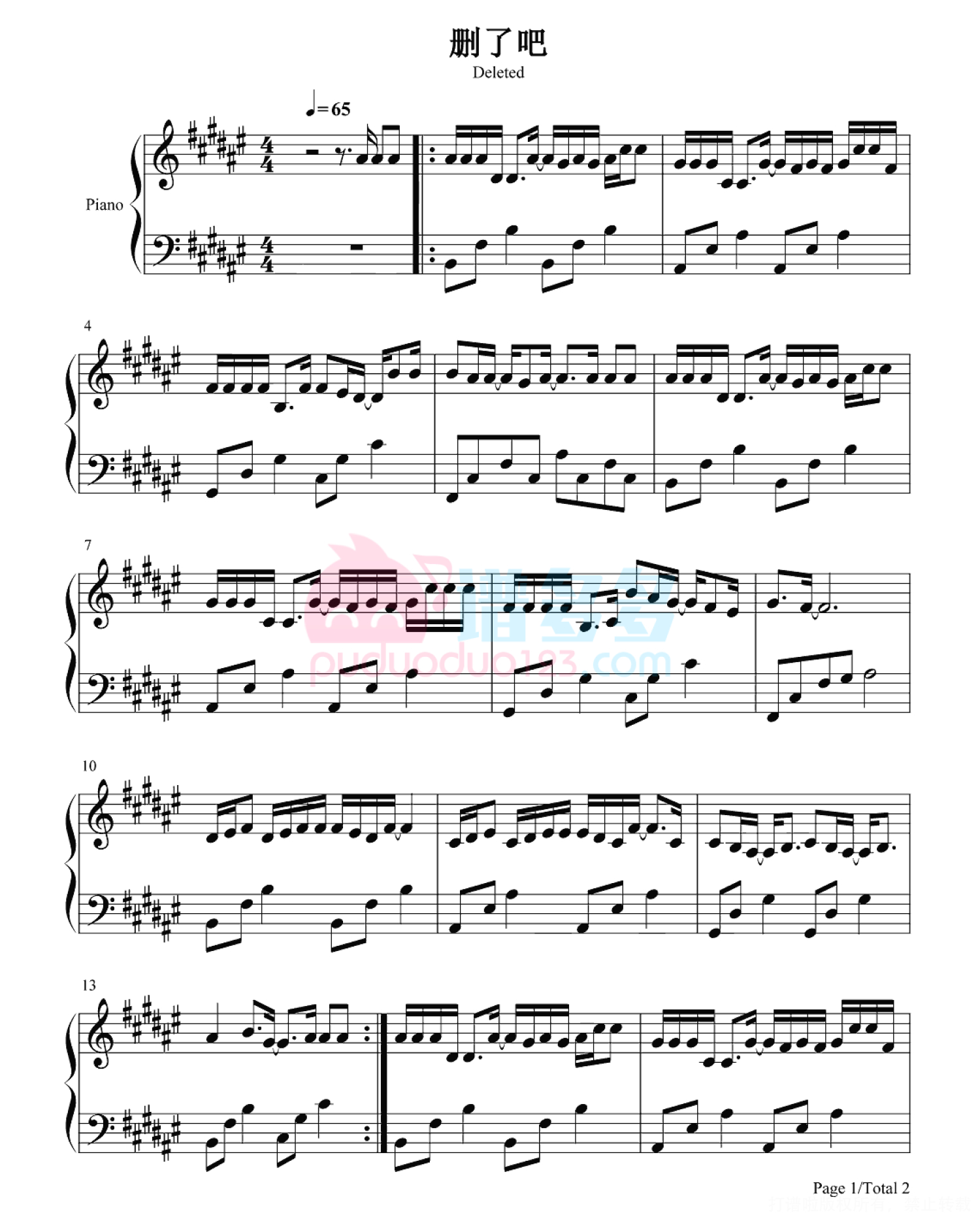 曲谱介绍: 该曲谱是高清版《删了吧》钢琴谱,由谱友精心编配制谱并分享。歌曲《删了吧》由烟(许佳豪)演唱,陶旧作词,楚明玉作曲,曾吴秋杰编曲。打谱啦还提供了烟(许佳豪)更多热门歌曲的简谱、钢琴谱等曲谱,欢迎查询。