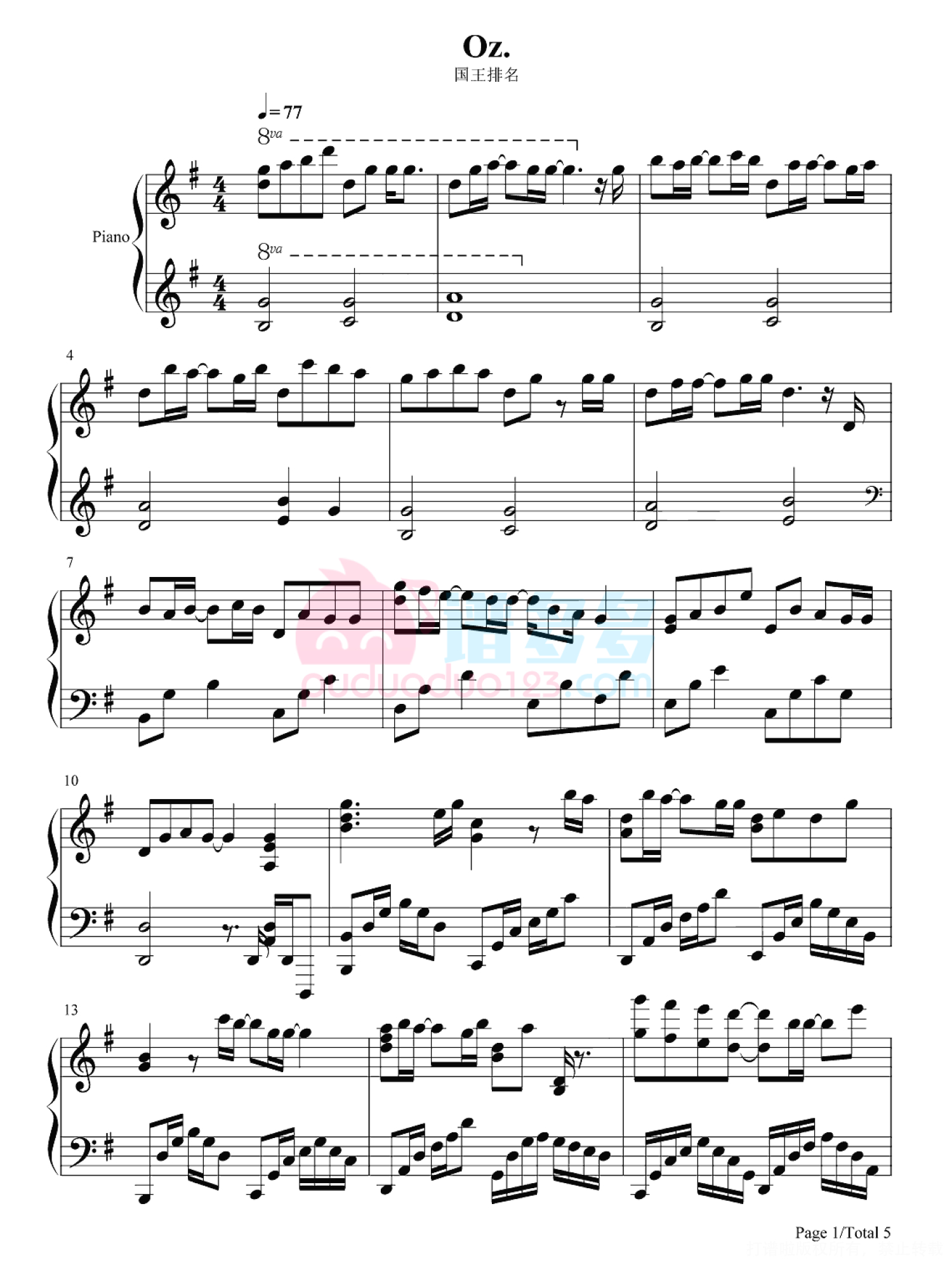 曲谱介绍: 打谱啦为您提供《Oz.》的高清版钢琴谱,由谱友精心编配制谱并分享。《Oz.》完整版钢琴谱,共5张PNG格式图片五线谱。《Oz.》由日本歌手yama演唱,同时也是电视动画片《国王排名》的片尾曲。