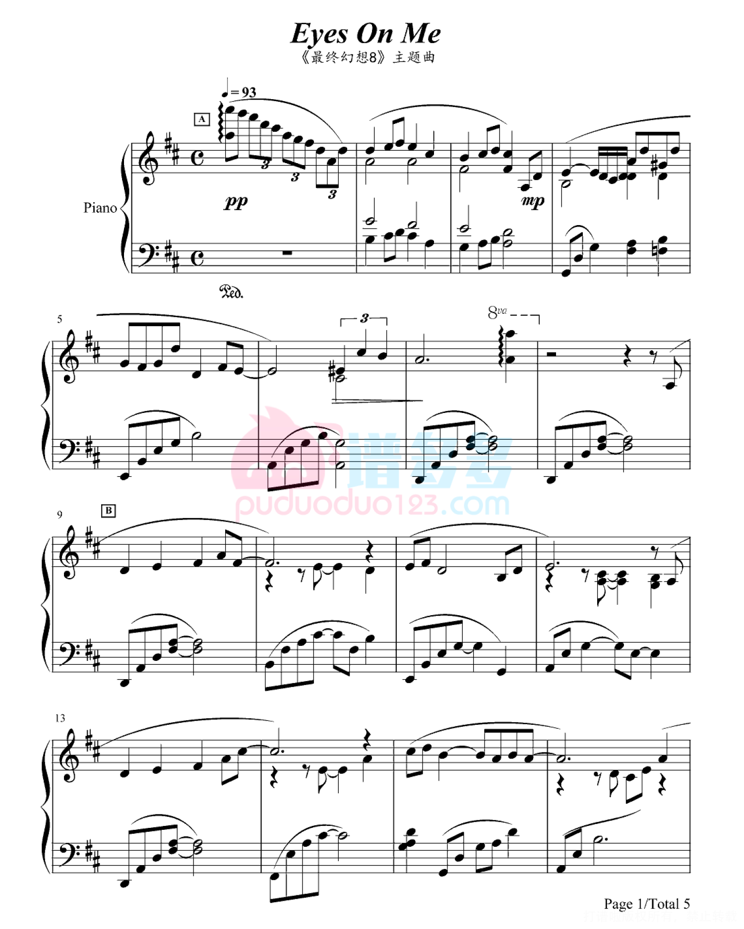 曲谱介绍: 王菲《eyes on me》钢琴谱,由谱友精心编配制谱,完整版共5张PNG格式图片五线谱。除了《eyes on me》高清版钢琴谱,打谱啦还收录了王菲更多热门歌曲不同类型或格式的曲谱,欢迎您浏览及分享。
