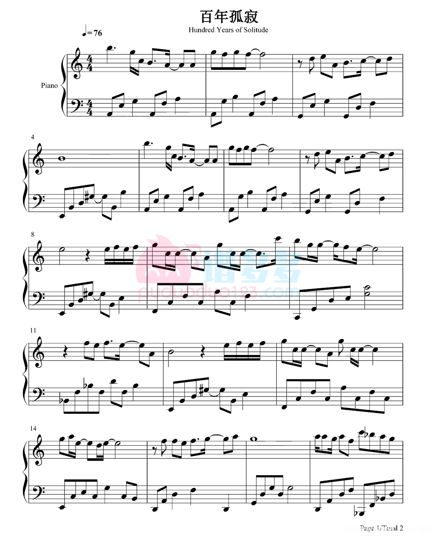 曲谱介绍: 该曲谱是高清版《百年孤寂》钢琴谱,由谱友精心编配制谱并分享。完整版《百年孤寂》钢琴谱,共2张PNG格式图片五线谱。《百年孤寂》是由林夕作词、王菲演唱,该曲的粤语版为《守望麦田》。另外打谱啦还提供了《百年孤寂》其它格式或类型的谱子,欢迎您收藏和分享。