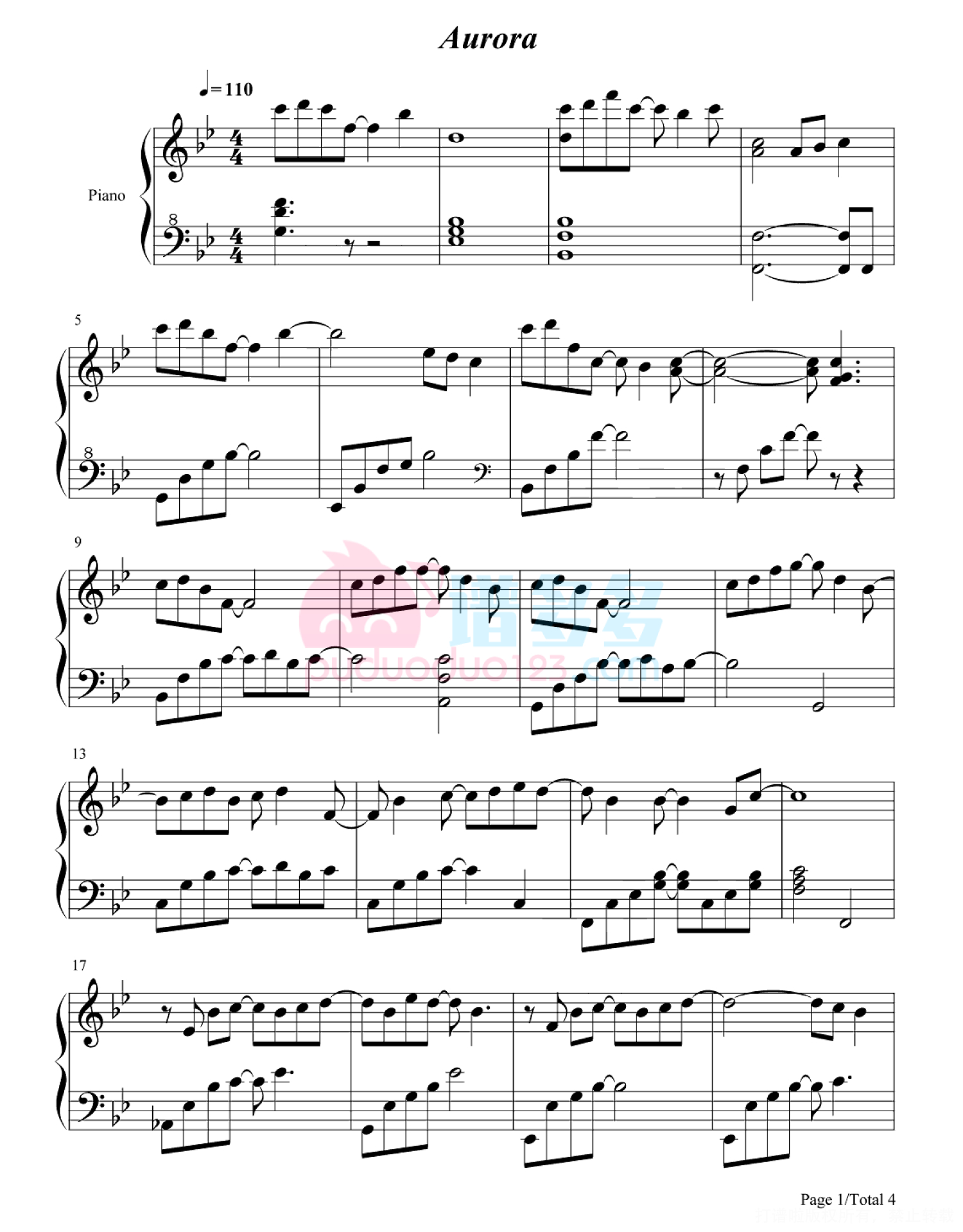 曲谱介绍: 打谱啦为您提供《Aurora》的高清版钢琴谱,由谱友精心编配制谱并分享。《Aurora》完整版钢琴谱,共4张PNG格式图片五线谱。《Aurora》是手机游戏《钢琴块2》的背景音乐。打谱啦还收录了《Aurora》其它类型或格式的曲谱,欢迎您浏览及分享。