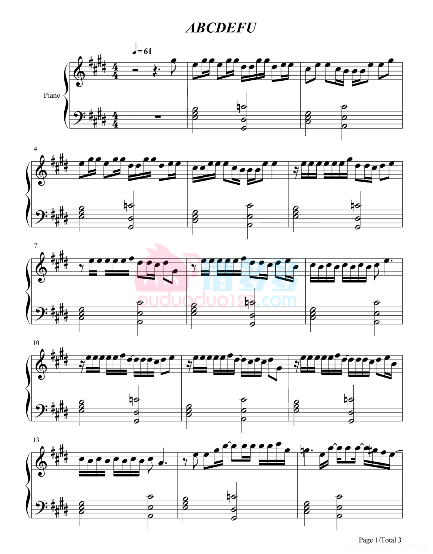 曲谱介绍: 该曲谱是高清版《ABCDEFU》钢琴谱,由谱友精心编配制谱并分享。完整版《ABCDEFU》钢琴谱,共3张PNG格式图片五线谱。《ABCDEFU》是美国歌手Gayle演唱的歌曲。另外打谱啦还提供了《ABCDEFU》其它格式或类型的谱子,欢迎您收藏和分享。