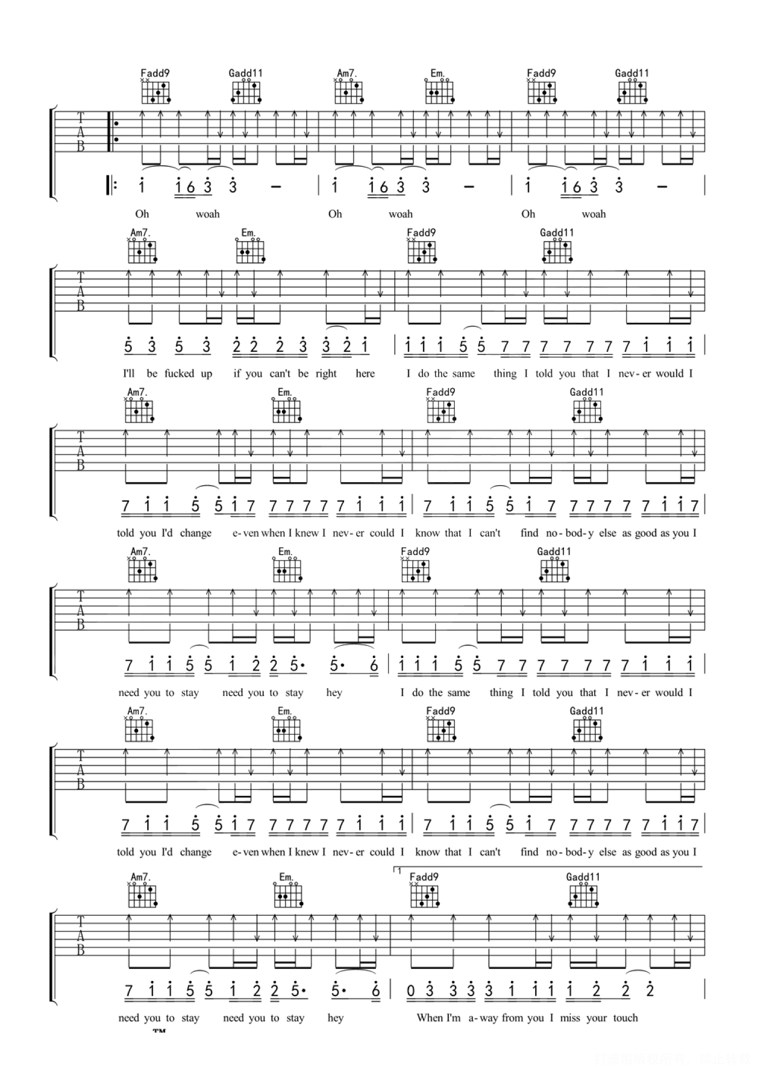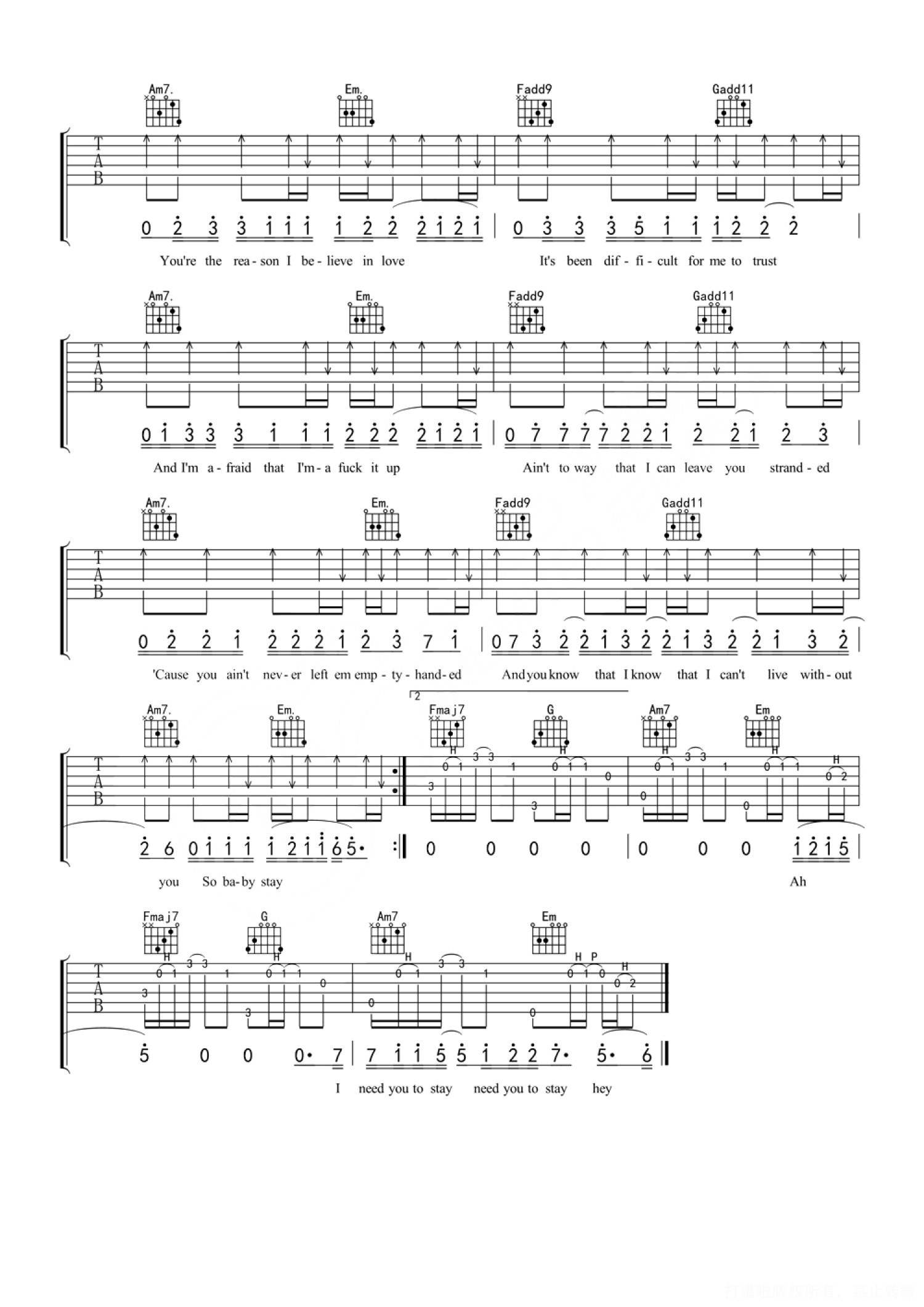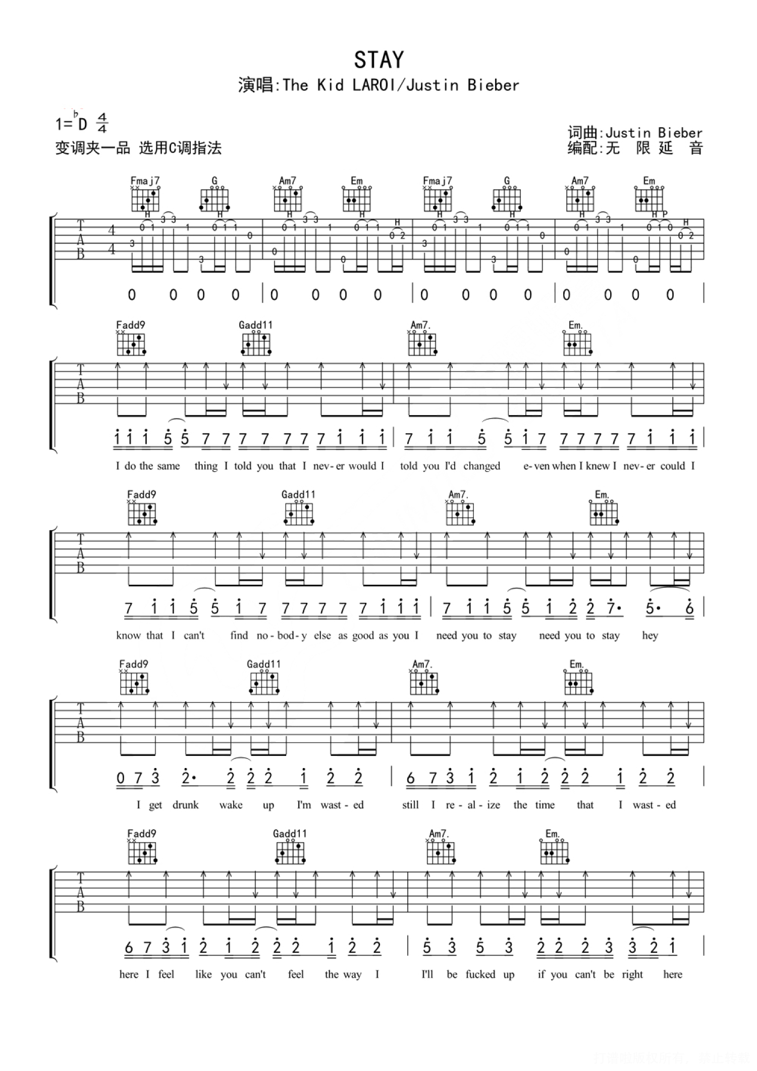 曲谱介绍: 贾斯汀·比伯《Stay》吉他弹唱谱,无限延音编配出品,共有3张高清图谱。