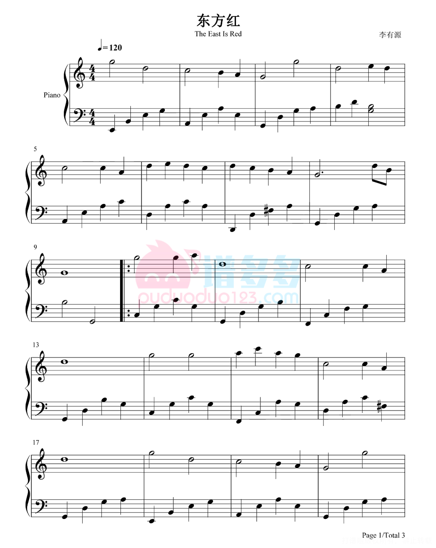曲谱介绍: 陕北民歌《东方红》钢琴谱,由谱友精心编配制谱,完整版共3张PNG格式图片五线谱。《东方红》依照《骑白马》的曲调改编而成,由李有源作词,李涣之编曲。歌曲以朴实的语言,唱出了人民群众对毛泽东主席及其领导的中国共产党的深情,歌词简单,情感真实,旋律好记!