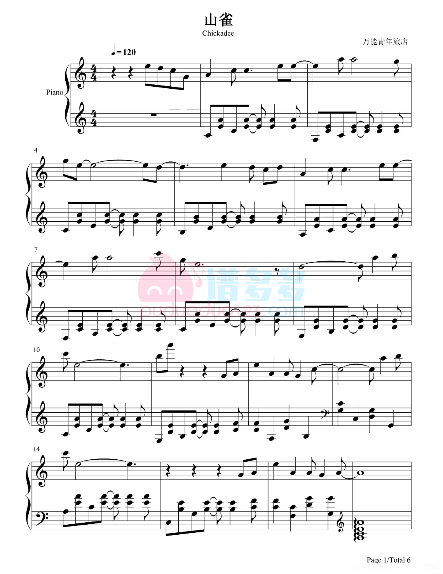 山雀钢琴谱 - 万能青年旅店