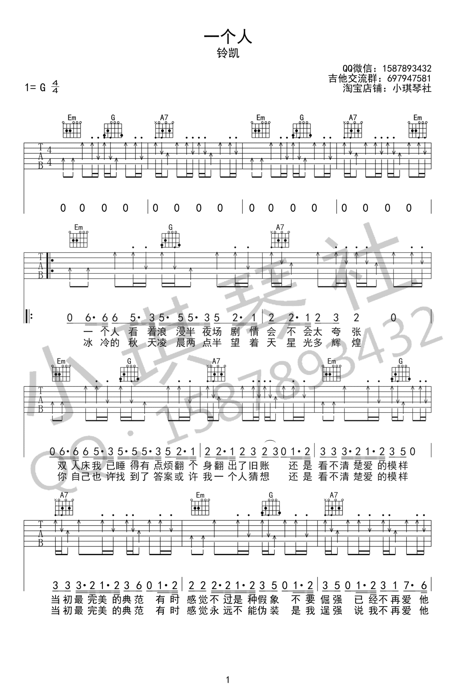一个人吉他谱 - 铃凯 - G调吉他弹唱谱