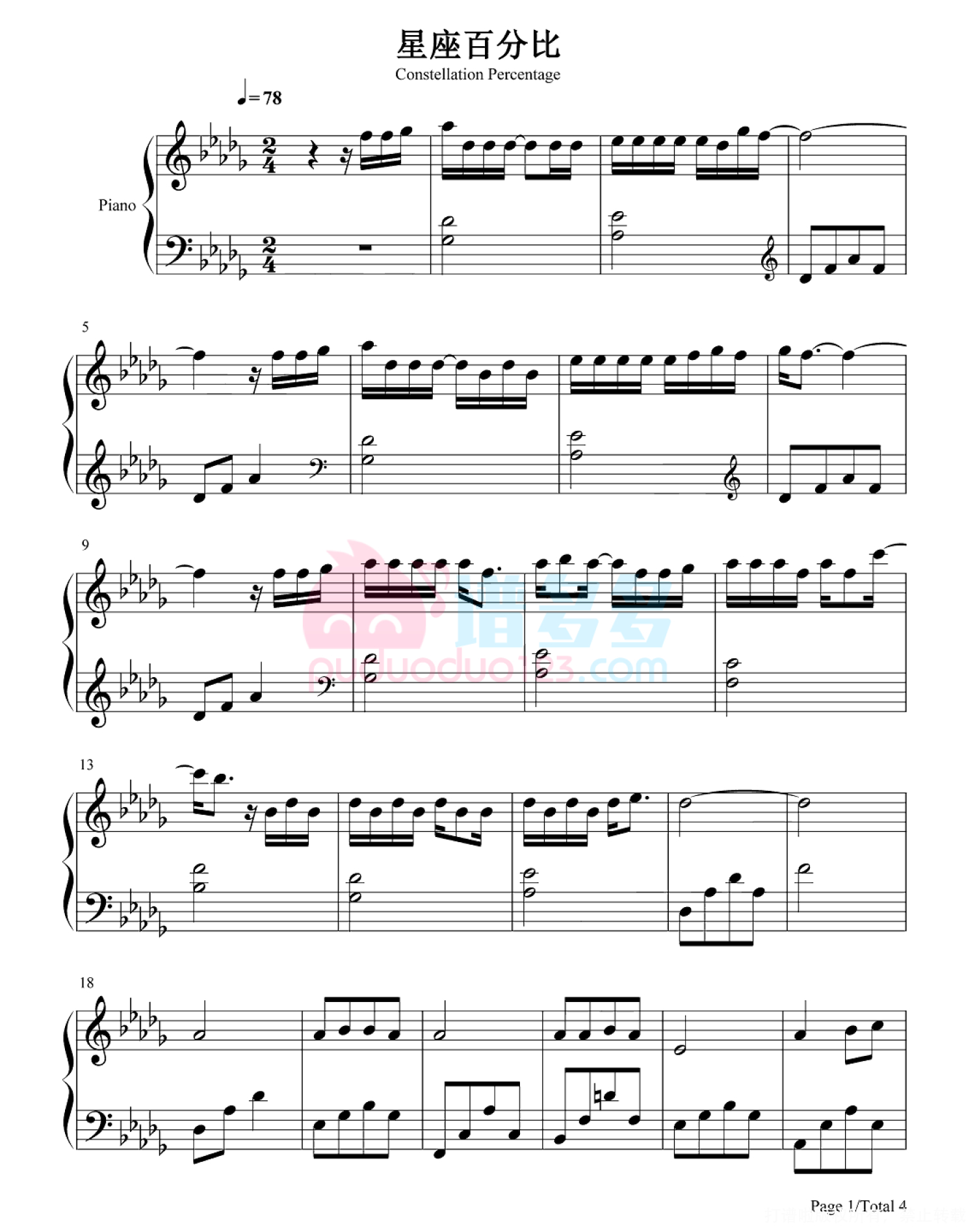 曲谱介绍: 叶炫清《星座百分比》钢琴谱,由谱友精心编配制谱,完整版共4张PNG格式图片五线谱。除了《星座百分比》高清版钢琴谱,打谱啦还收录了叶炫清更多热门歌曲不同类型或格式的曲谱,欢迎您浏览及分享。