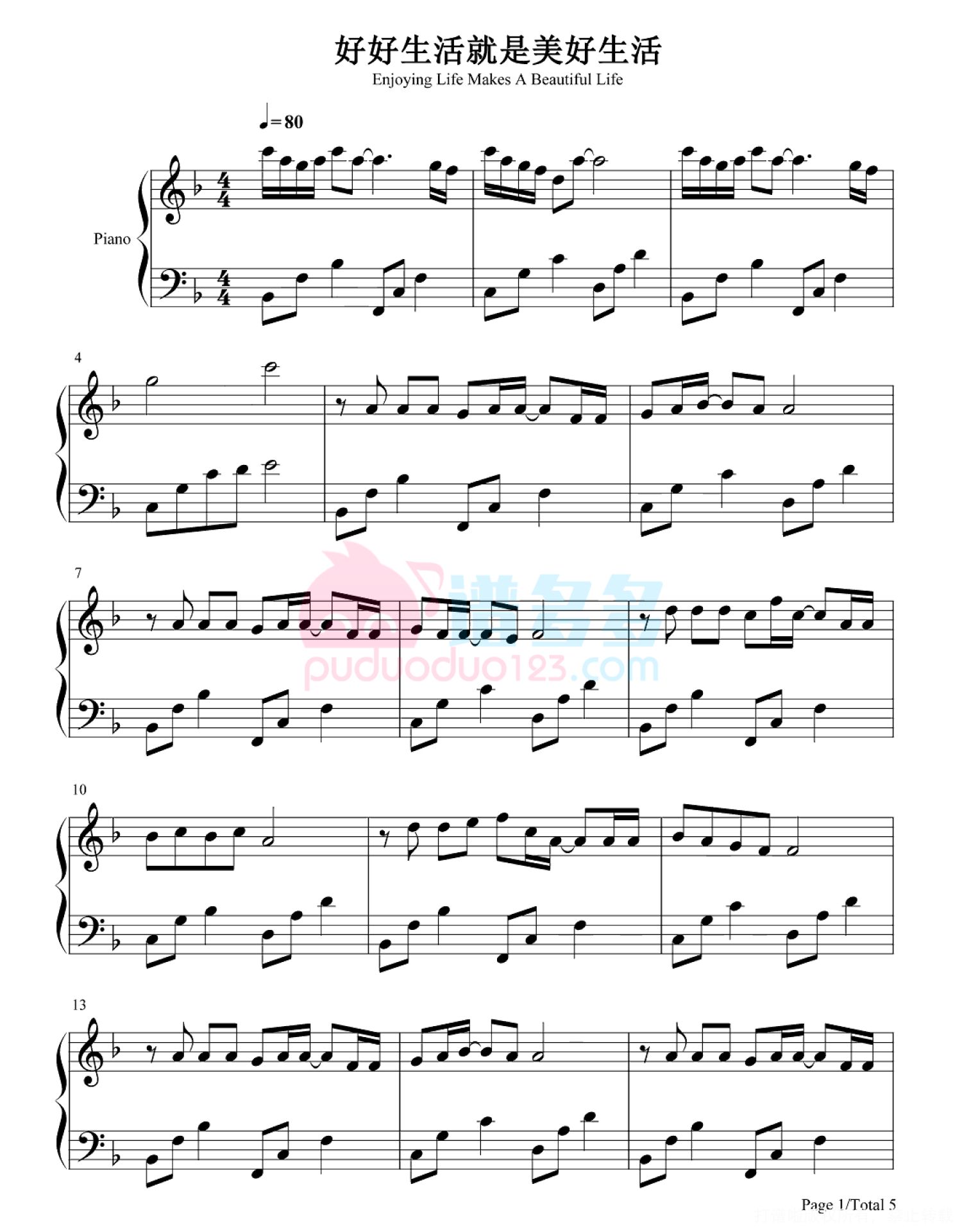 曲谱介绍: 本曲谱是周深演唱的《好好生活就是美好生活》钢琴谱,由谱友精心编配制谱,完整版共5张图片五线谱。该曲是抖音2022跨年主题曲,歌词摘取自抖音用户的真实评论。歌词很简单,很质朴,但很动人,充满烟火气,听着听着好像2021年的一幕幕在眼前不停地掠过。