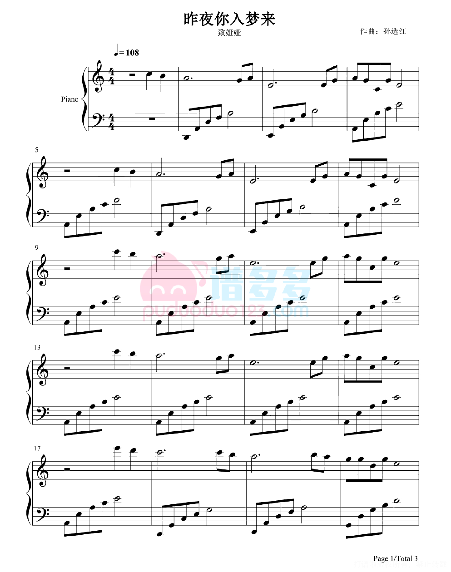 曲谱介绍: 孙选红《昨夜你入梦来》钢琴谱,由谱友精心编配制谱,完整版共3张PNG格式图片五线谱。除了《昨夜你入梦来》高清版钢琴谱,