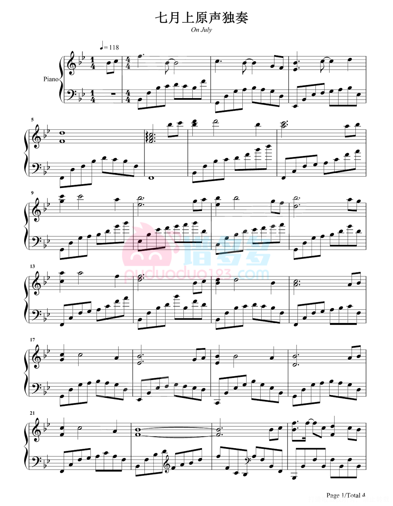 曲谱介绍: Jam《七月上》钢琴谱,由谱友精心编配制谱,完整版共4张PNG格式图片五线谱。除了《七月上》高清版钢琴谱,打谱啦还收录了Jam更多热门歌曲不同类型或格式的曲谱,欢迎您浏览及分享。