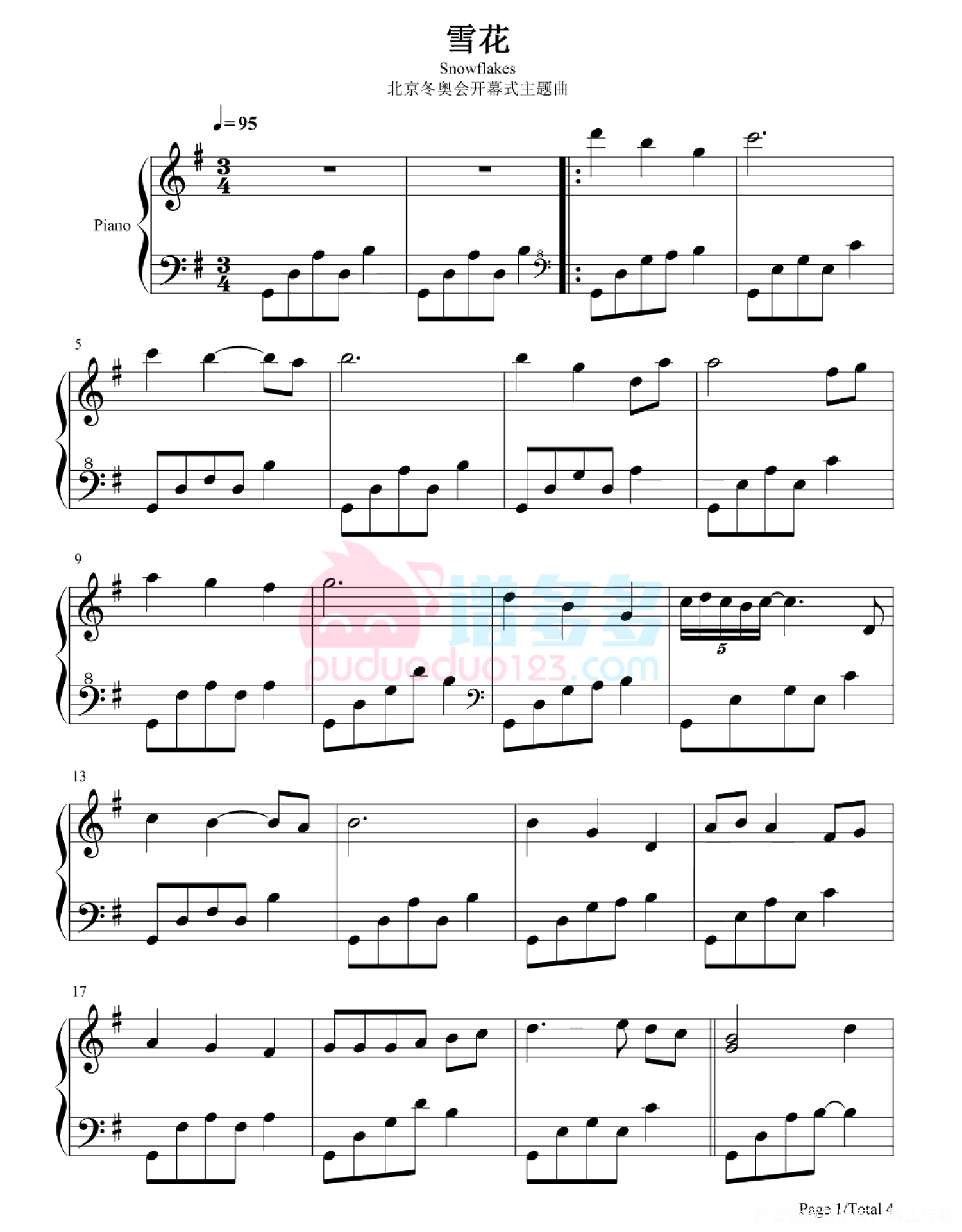 曲谱介绍: 该版本的《雪花》钢琴谱是高清完整版五线谱,共4张PNG格式图片谱。“雪花,雪花,开在阳光下……”2月4日,在2022北京冬奥会开幕式上,由北京爱乐合唱团的孩子们演唱的主题歌《雪花》响彻鸟巢,孩子们空灵、清澈的声音如晶莹剔透的雪花落到了每个人的心里。 2022北京冬奥会开幕式主题曲《雪花》钢琴谱1 2022北京冬奥会开幕式主题曲《雪花》钢琴谱2 2022北京冬奥会开幕式主题曲《雪花》钢琴谱3 2022北京冬奥会开幕式主题曲《雪花》钢琴谱4 这支合唱团不仅是国内童声合唱的标杆,更与奥运有着颇深的缘分,不仅参加此次北京冬奥开幕式,合唱团于1993年和2001年都曾助力北京申奥,用歌声向全世界展示中国孩子的风采。