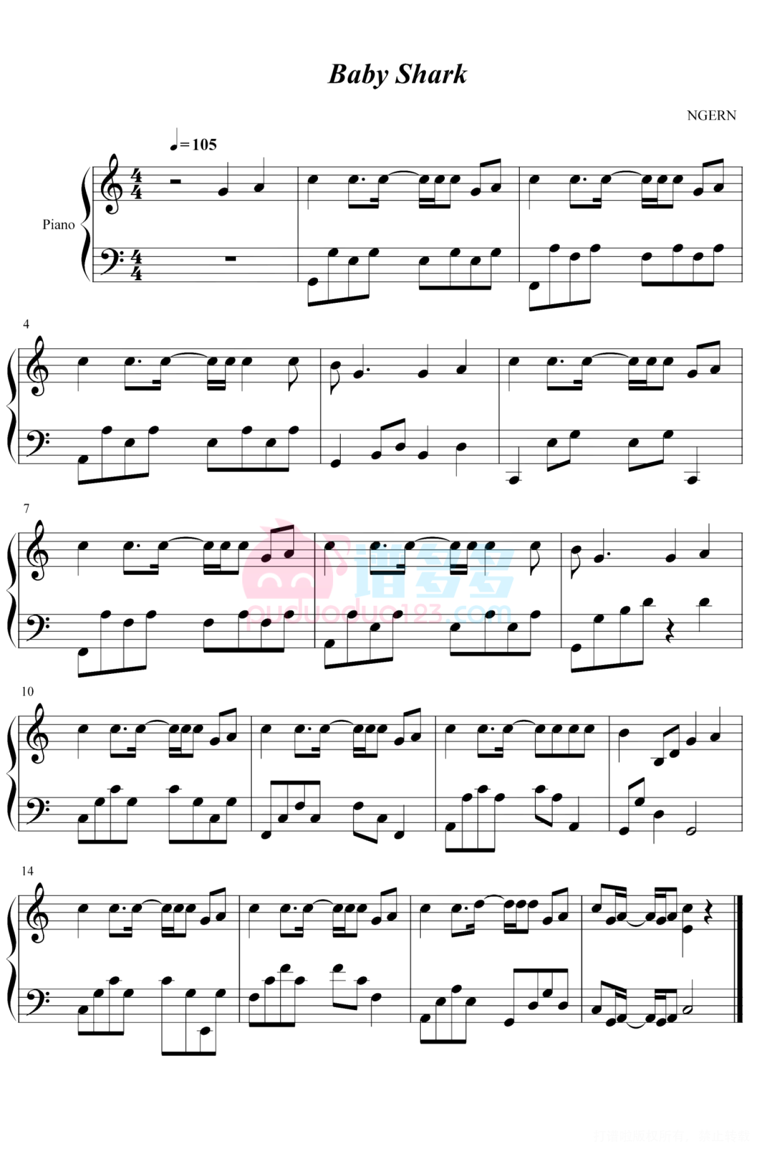 曲谱介绍: 火遍全球神曲《Baby shark》,动起来~ 这首由韩国制作公司 Pinkfong 上传到 YouTube 上的洗脑儿童歌曲已被播放超过 70 亿次,相当于如果连着放这首歌能放 3 万年。这个纪录超过了之前的冠军《Despacito》,为 Pinkfong 公司带来了 500 万美元的收入。 《Baby Shark》花了四年爬到了榜单顶端。但据说这首歌的来源更早,有人说来自 70 年代的美国夏令营,也有人认为这首歌的起源是斯皮尔伯格的电影《大白鲨》。在有的版本的歌词里,一个冲浪手被鲨鱼咬掉了胳膊,在另一个版本里主人公丧命鲨鱼之口。 但最出名的还是 Pinkfong 的版本。MV 里的舞蹈被编入韩国当红女团的现场表演里。推特上也出现了 BabySharkChallenge,引来各界人士模仿其舞蹈,从 Cardi B 到印度尼西亚农民,无奇不有。Pinkfong 的市场经理也告诉记者,公司认为这首歌与温婉的传统童谣不同,它非常流行且颜色鲜艳,再配上有趣的舞步,这就是下一代的 K-pop。 公司同时还考虑把这首歌改编成电影和音乐剧,指明要和经典童谣《一闪一闪亮晶晶》对打。