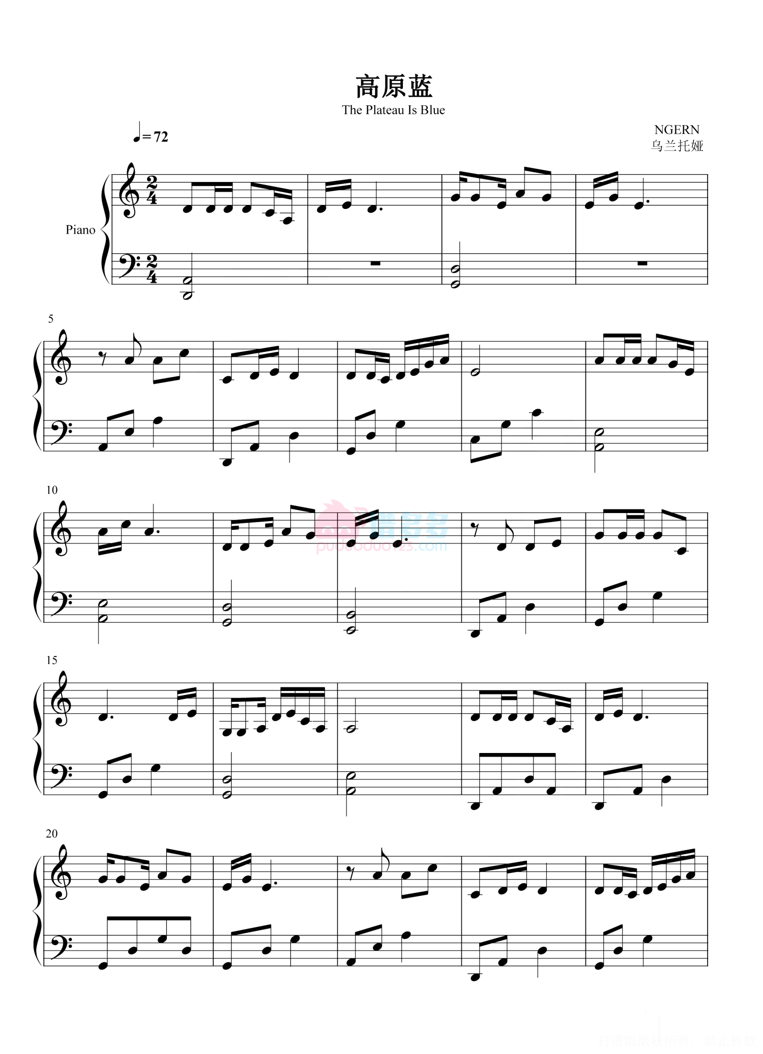高原蓝钢琴谱 - 乌兰托娅