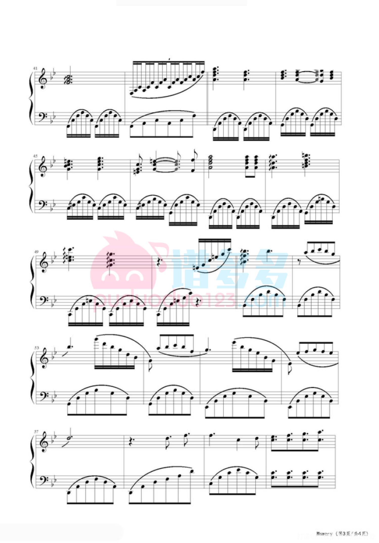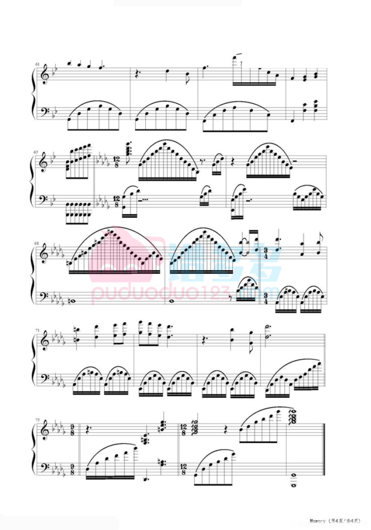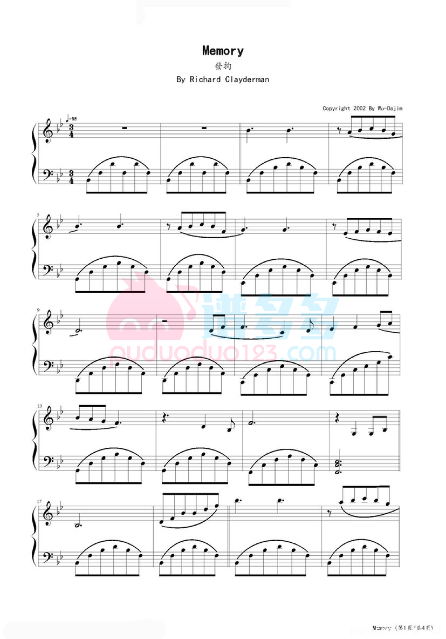 曲谱介绍: 《Memory-回忆》原来是英国音乐剧《猫》(Cats)中的选曲。剧本是根据英国诗界巨擘托马斯·艾略特的诗篇《老负鼠的实用老猫经》改编的,由当代英国的音乐剧大师安德鲁·劳伊德·韦伯作曲,名导演曲瑞福尔·能恩执导,1981年5月11日在伦敦首演,获得6项戏剧年度奖。1982年10月,《猫》剧全班人马到美国纽约百老汇演出,一炮打响,夺得当年包括最佳音乐剧、最佳作曲在内的7项托尼奖。《猫》剧目前在13个国家用10种语言演出。 《Memory-回忆》,出自理查德克莱德曼专辑《理查钢琴王子·水晶钢琴梦幻情语》,发行时间是2004年。