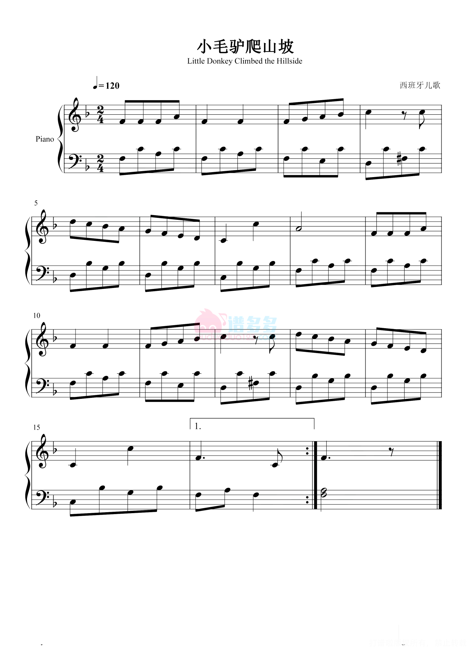 小毛驴爬山坡钢琴谱 - 西班牙儿歌
