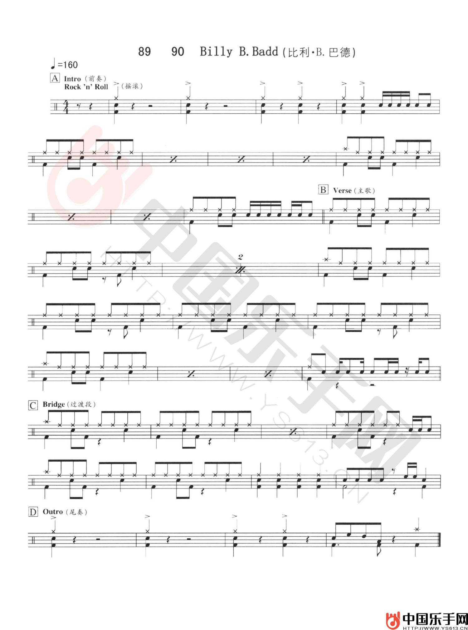 曲谱介绍: 摇滚曲《比利巴德》架子鼓谱爵士鼓 附鼓谱伴奏曲,速度每分钟160拍