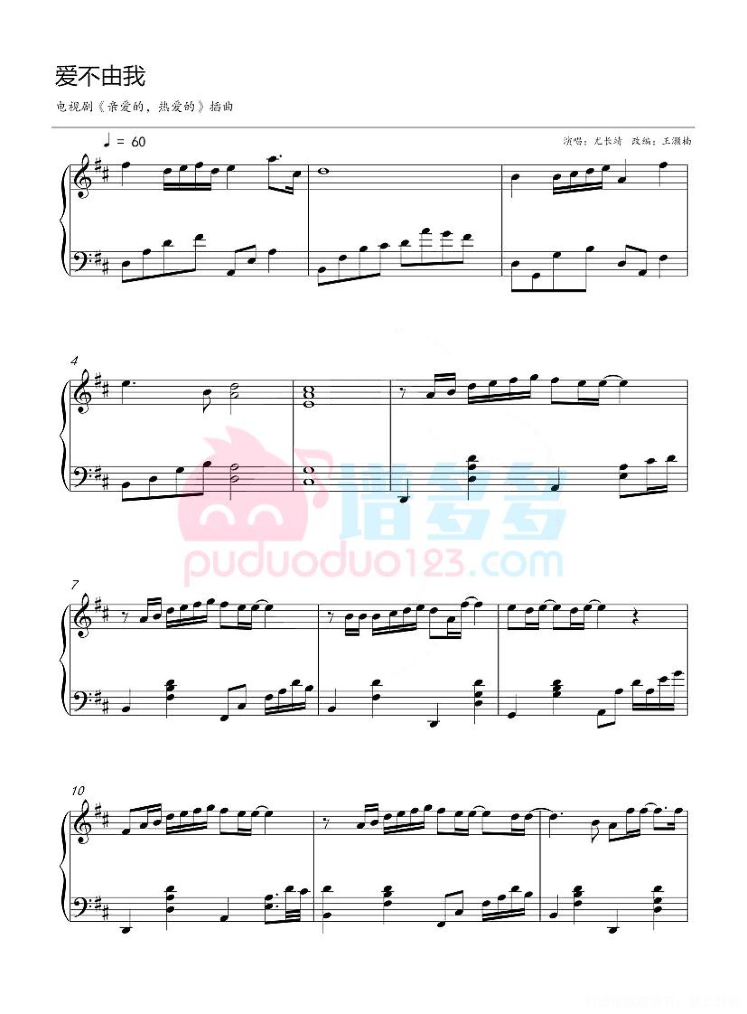 曲谱介绍: 暖心爱恋剧《亲爱的,热爱的》根据墨宝非宝小说《蜜汁炖鱿鱼》改编,杨紫、李现等主演,尤长靖为电视剧演唱插曲《爱不由我》。 《爱不由我》由音乐人郑国锋、张鹏鹏联手打造,是一首以剧中男主情感视角为出发点的优质情歌。尤长靖凭借出众的唱功与沉稳的情感掌控力,在这首歌曲的演绎中,对主人公的情绪起伏拿捏精准,跟随旋律用声线上演了一场陷入情感困境后的矛盾拉扯与自我和解。