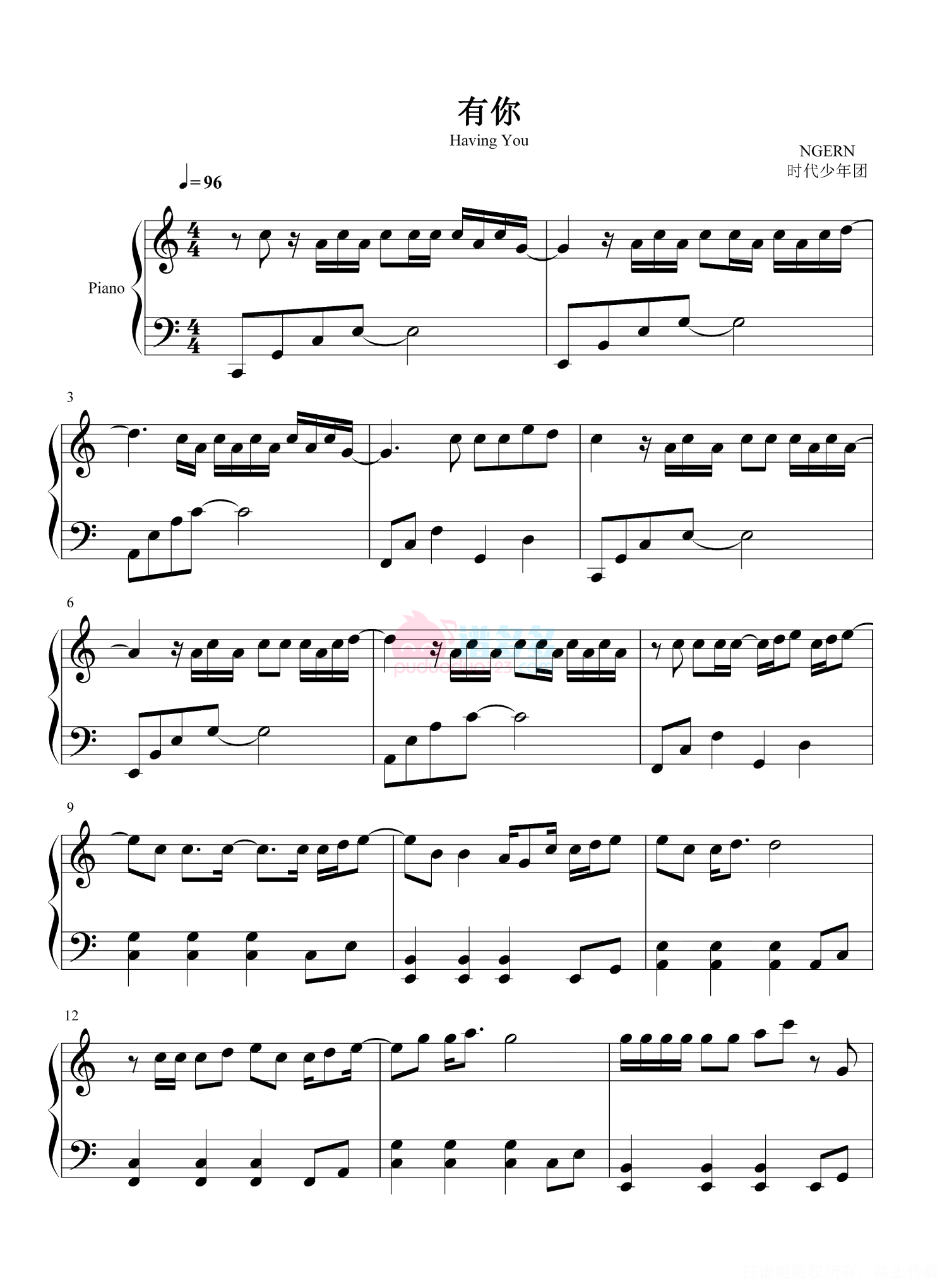 有你钢琴谱 - 时代少年团