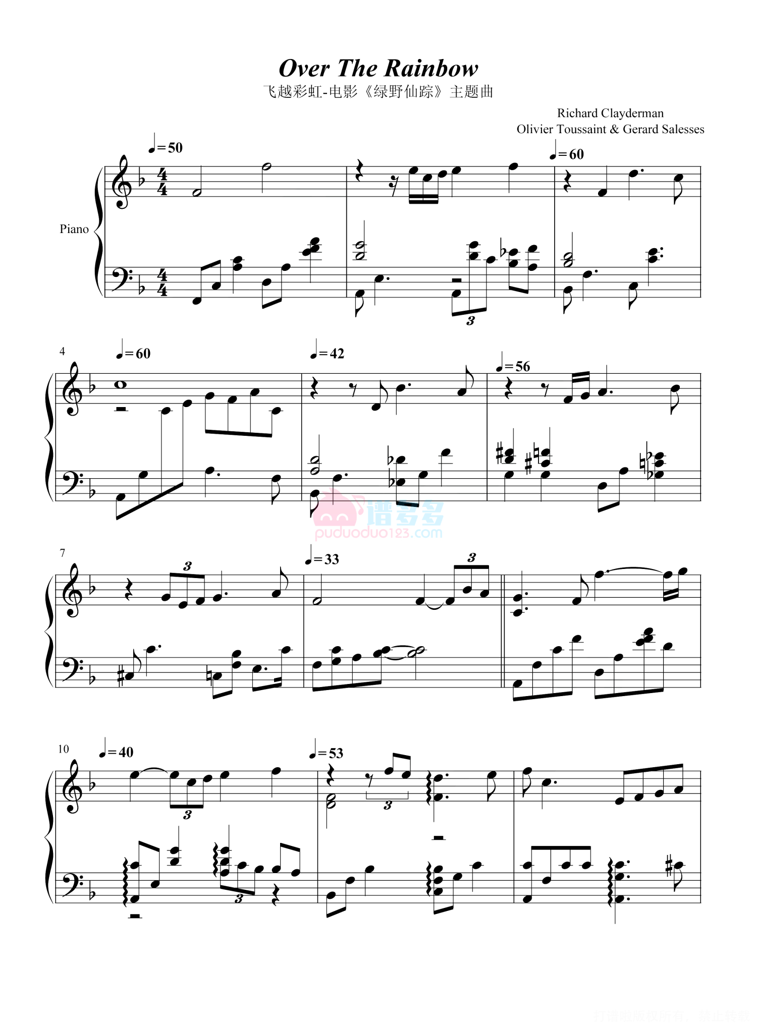 曲谱介绍: 歌曲最早是出现在米高梅公司于1939年出品的童话音乐片《绿野仙踪》(The Wizard of OZ)。 在第12届奥斯卡颁奖典礼中,这部电影获得了最佳原创音乐和最佳歌曲奖。 《绿野仙踪》在开始时是黑白片,在小女孩进入梦境后变成了彩色画面,并配上《飞跃彩虹》的音乐,让许多人留下童年璀璨的回忆。 剧中的《彩虹之上》(Over the rainbow)一时广为传唱。透过歌曲,指向的是雨后美丽的彩虹之乡,象征着和平的希翼,成为了人们对现实的美好祝愿。