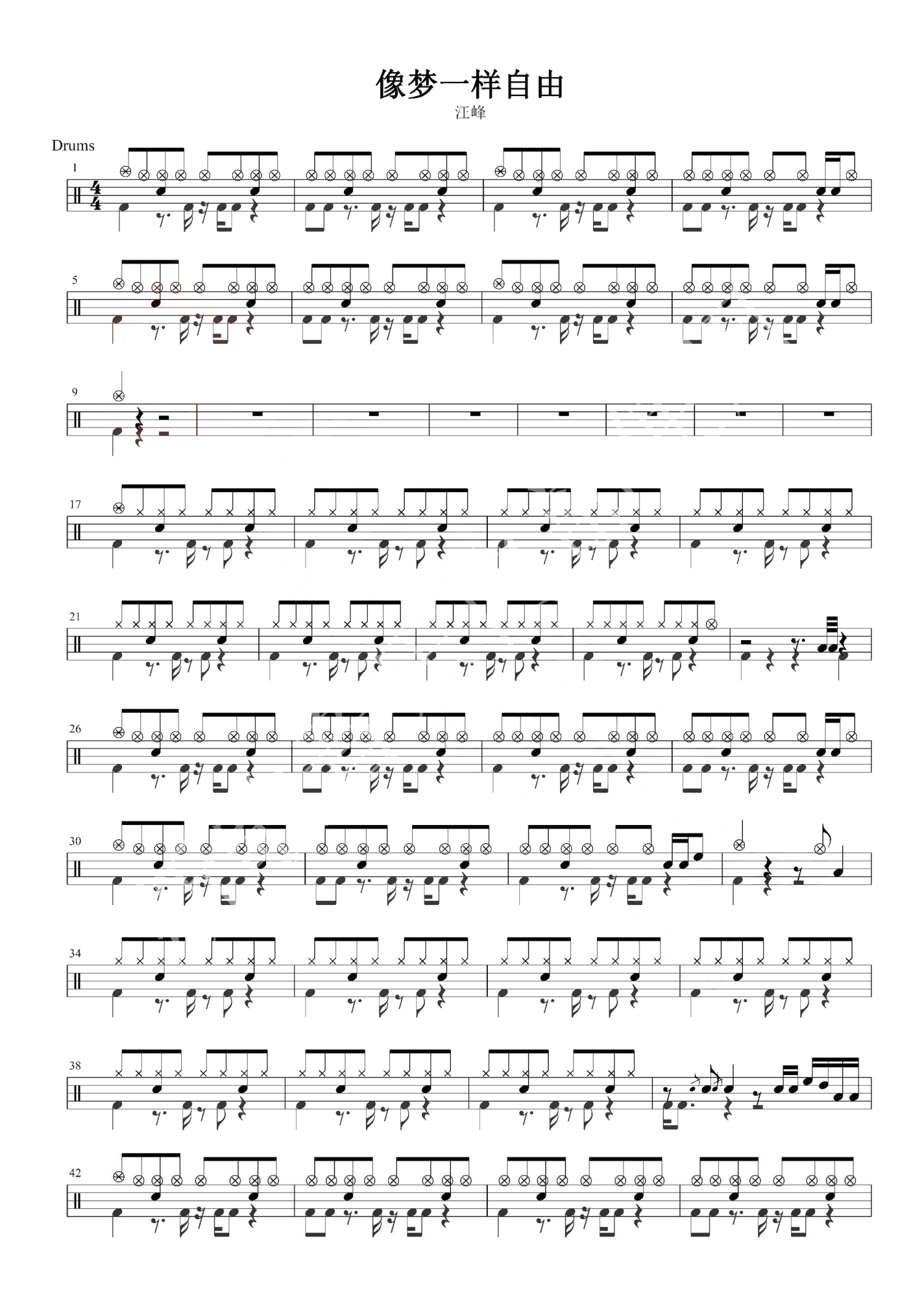 像梦一样自由鼓谱 - 汪峰 - 架子鼓谱
