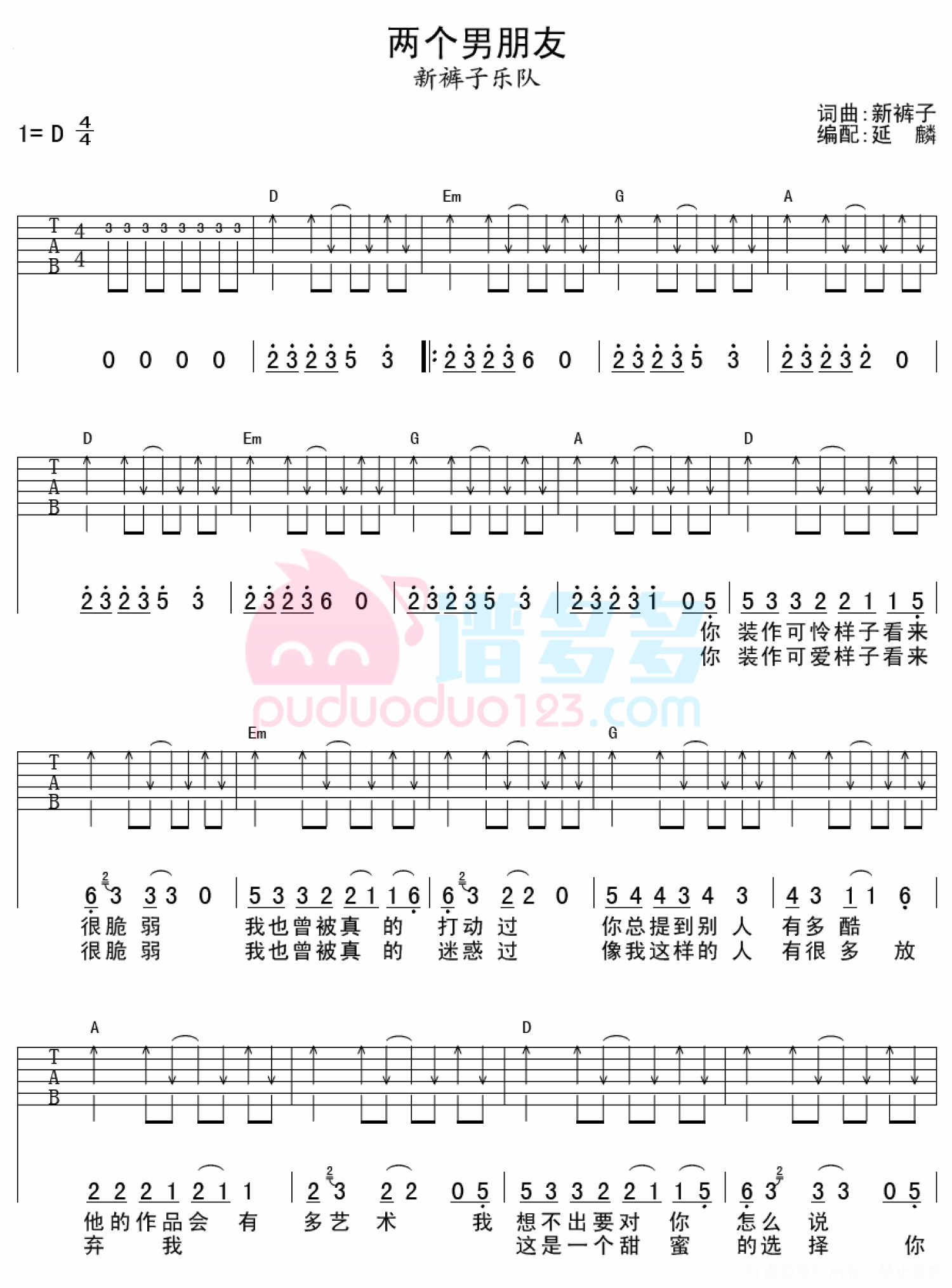 两个男朋友吉他谱 - 新裤子乐队 - D调吉他弹唱谱