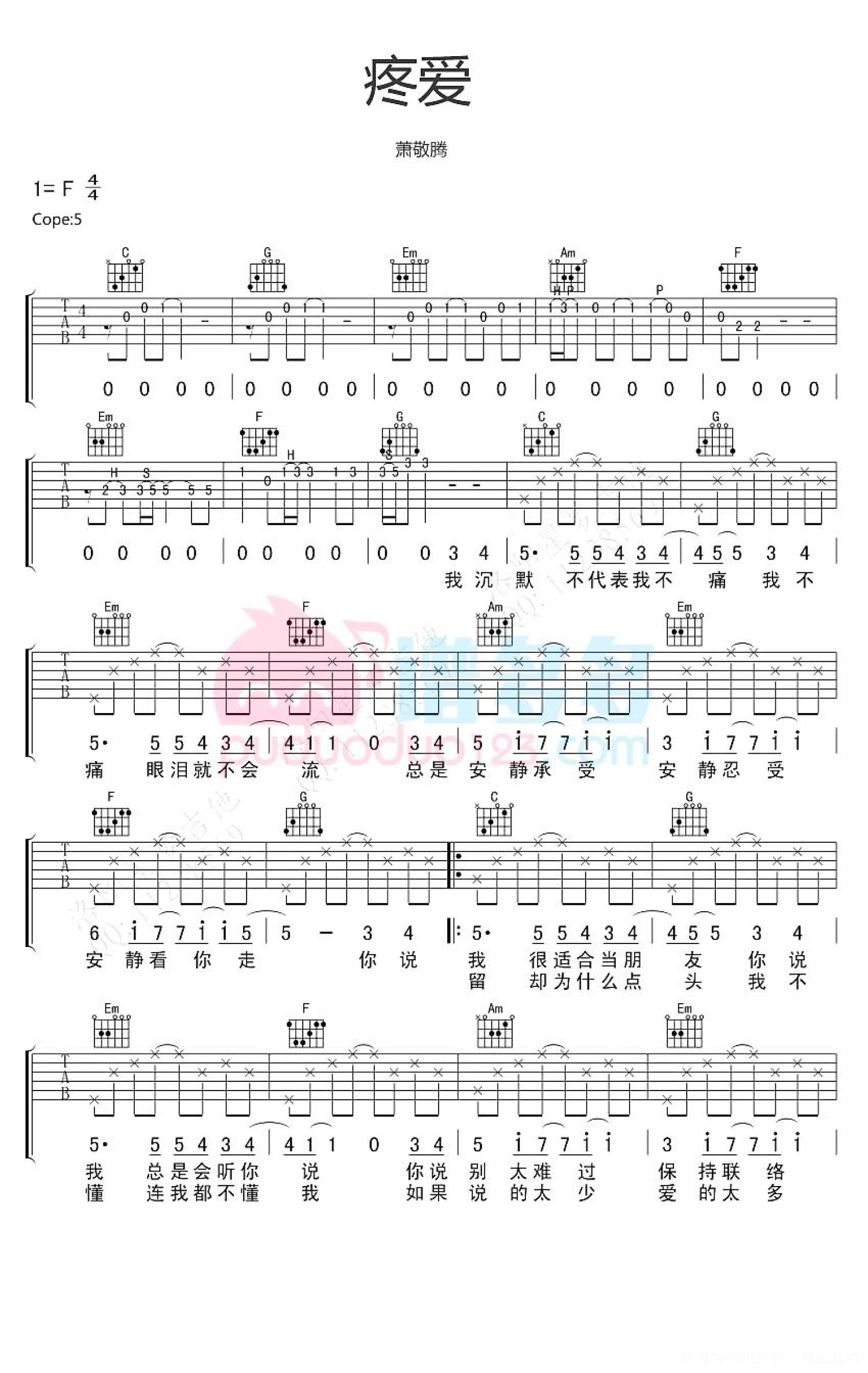 曲谱介绍:   五月天阿信也为萧敬腾量身打造《疼爱》,一首中版的轻快歌曲,简单的旋律,轻快的节奏,舒服的声音,让人有种纾压的感觉。 在2018年7月25日五月天在上海金山举办的LIFE人生无限公司巡回演唱会中,五月天邀请萧敬腾做为演唱会嘉宾,阿信与萧敬腾两人首次同台合唱了《疼爱》,官方也剪辑了完整MV。
