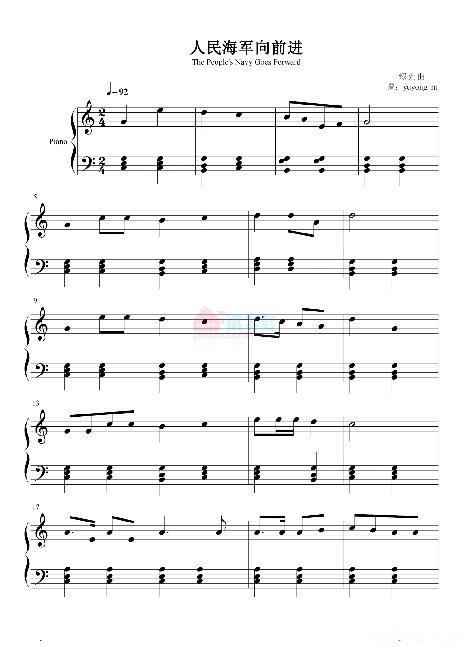 曲谱介绍: 《人民海军向前进》创作于1951年。虽未正式定为海军军歌,但实际上已经默认其作为中国人民解放军海军军歌。国庆60周年大阅兵时,这首曲子也曾作为阅兵的军歌被奏响过,而且这首歌也一次次出现在纪念海军活动的各种重要场合。 作曲家:绿克(本名:刁锦富),1935年生,镇江谏壁镇人,此曲是他于1950年高中时创作的处女作。据说刁老从小是在有钱人家偷学钢琴演奏,被老师发现,教到了小学毕业。中学上了教会学校,刁老天赋很好,在教会钢琴班里学会了很多中外名曲。朝鲜战争爆发,美国人的航空母舰封锁了台湾海峡,15岁的刁锦富也上街参加了抗议游行。后来在报纸上看到了一首小诗《人民海军向前进》,在脑海中随机涌现了主旋律,于是立即用简谱写了下来,再经过两三天修改后,成为从未写过歌曲的他的第一首作品。那时称“海洋”都称“绿色的海洋”,“人民海军要劈波斩浪,克服困难,战胜海洋。”于是,刁锦富便以“绿克”的笔名,把自己的第一首作品寄到上海人民广播电台,在1951年下半年,上海广播乐团通过广播教唱了《人民海军向前进》,从此这首歌迅速在全国传开。 军歌《人民海军向前进》自此流传不衰,虽然歌词有些改动,但曲子始终没变,歌曲以昂扬激奋的旋律唱出了海军战士建设新中国海军的高涨热情和保卫祖国海疆的大无畏精神。这首歌问世后,成为海军代表性的歌曲、海军战士音乐形象的写照,广泛流传几十年仍葆有艺术生命力,成为新生的人民海军的代表歌曲。