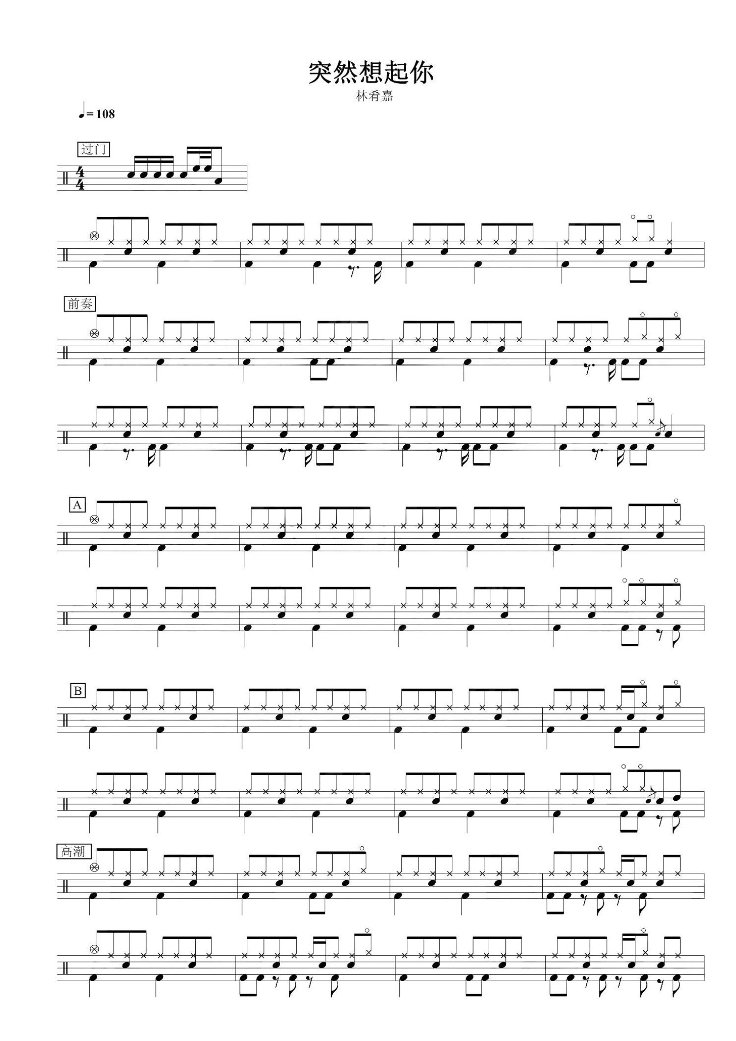 曲谱介绍: 突然想起你架子鼓谱是由林宥嘉演唱的一首歌曲,作词:林夕、作曲:陈伟,抖音热曲4/4拍节奏,每分钟108拍