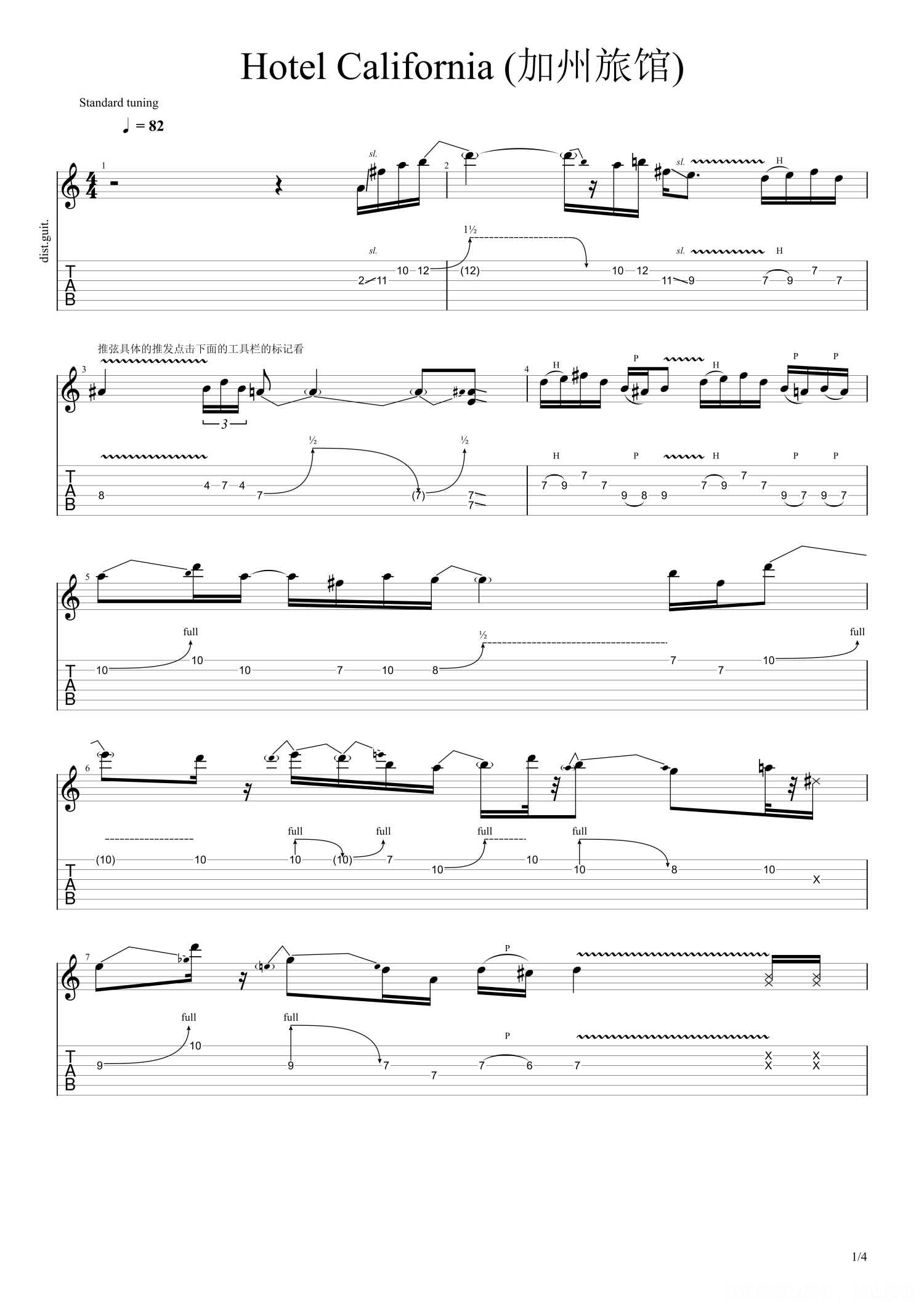 曲谱介绍: 加州旅馆《HotelCalifornia》电吉他谱,打谱啦编配出品,共有4张高清图谱。