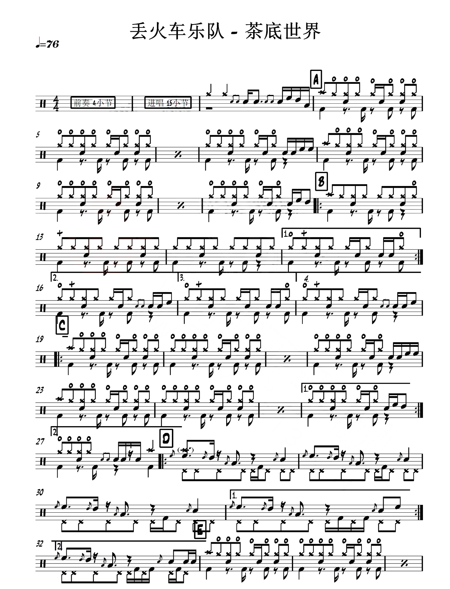 曲谱介绍: 茶底世界鼓谱是丢火车乐队演唱的一首歌曲,曲词:球子,收录于专辑《丢火车》中,4/4拍节奏,每分钟76拍