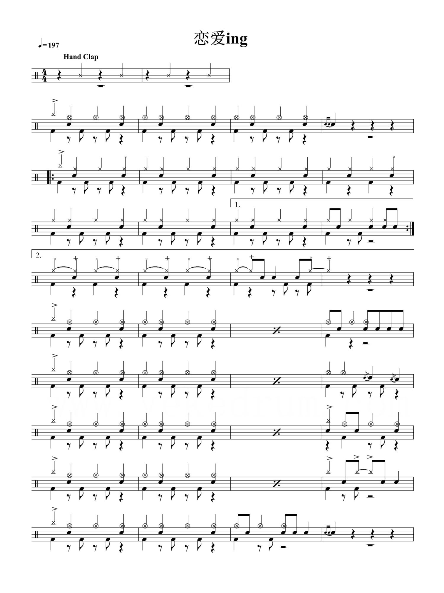 曲谱介绍: 恋爱ing鼓谱是由五月天演唱的一首歌曲,曲词:阿信,4/4拍节奏,每分钟197拍,是2011年电视剧《门当父不对》的片头曲