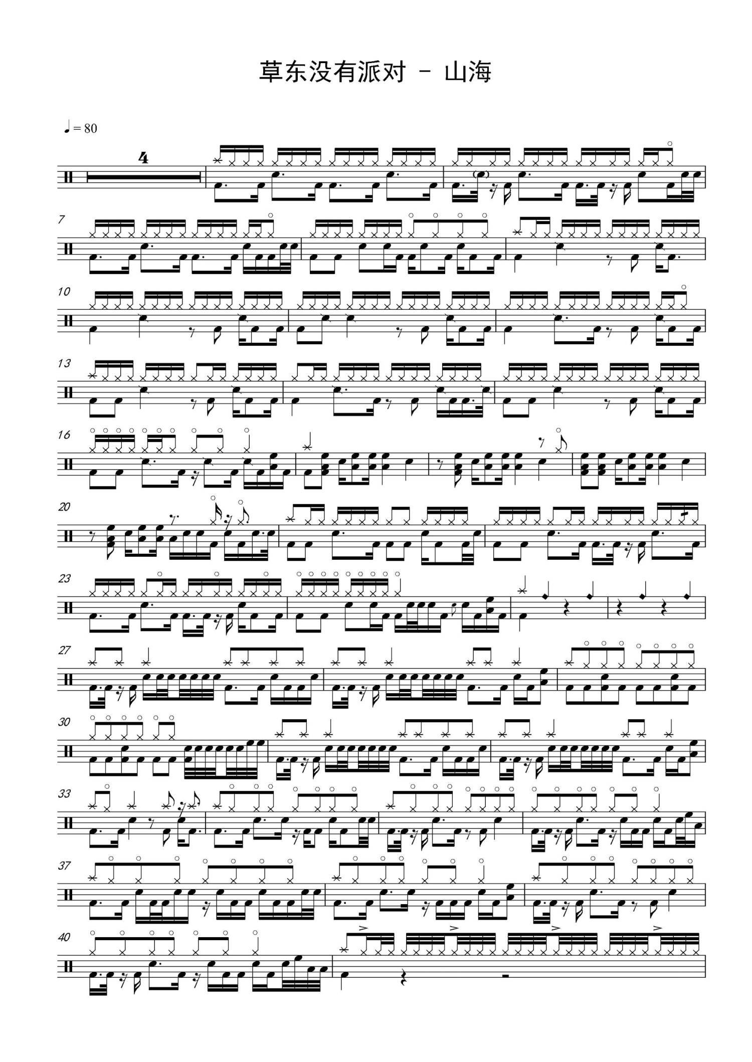 曲谱介绍: “山海”鼓谱是由草东没有派对创作并演唱的一首歌曲,曲词:草东没有派对,4/4拍节奏,每分钟80拍