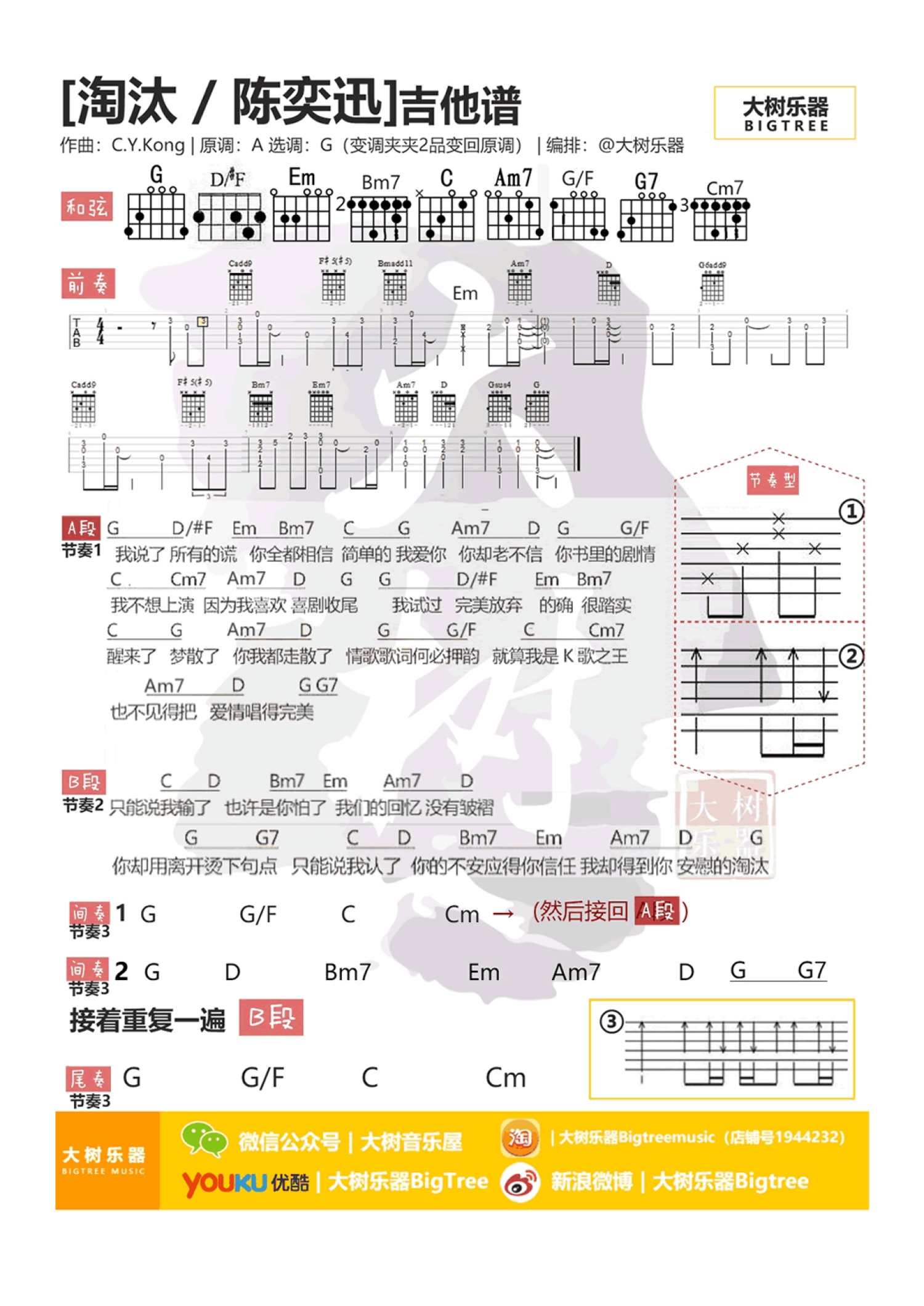 曲谱介绍: 陈奕迅《淘汰》吉他谱,原调A,变调夹夹2品,选用G调指法。这首《淘汰》是典型的“陈式情歌”,唱出了相爱的无奈和遗憾,Eason独特的嗓音更是给歌曲赋予了一种痛彻心扉的苦涩和心酸。