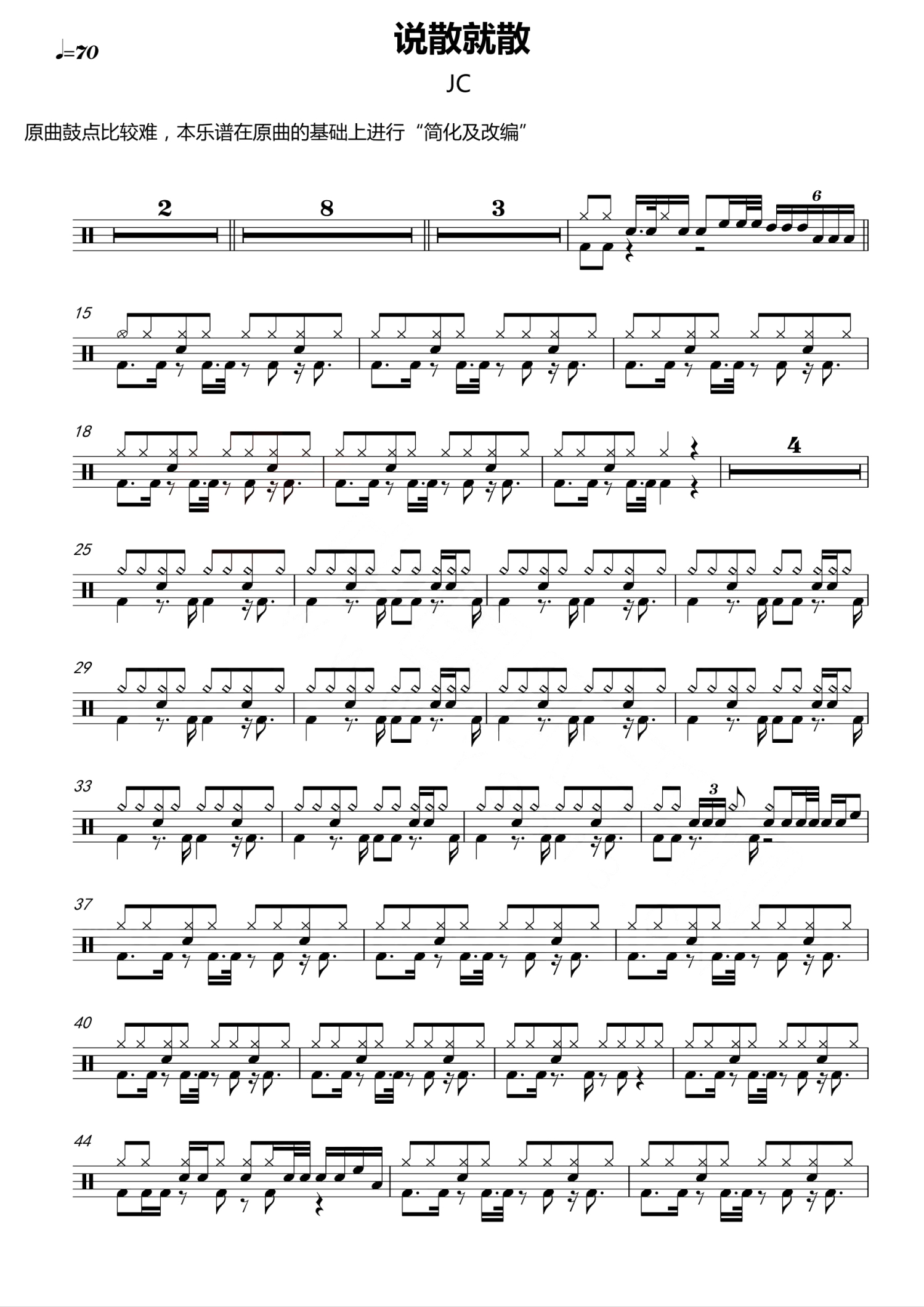 • 说散就散鼓谱 - JC陈咏桐 - 架子鼓谱第1张