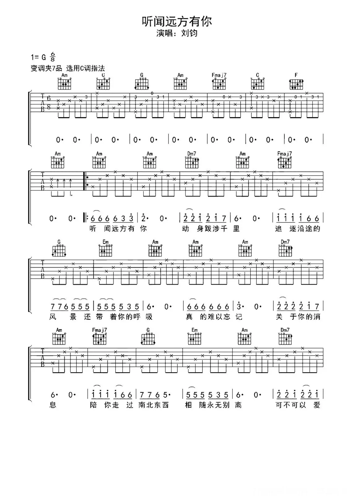 曲谱介绍: 刘钧《听闻远方有你》吉他弹唱谱,共有3张高清图谱。